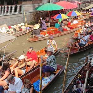 タイ・バンコクの水上マーケットでは、船で商品を売買する昔ながらの市場を見学できます。果物や雑貨を積んだ小舟が運河を行き交う活気ある様子は、タイらしい雰囲気がいっぱい。バンコクから行ける市場は主に3つあり、車で約2時間以内の場所にあります。バスや電車で行けますが、本数が少ないためツアー参加をおすすめします。 ■ダムヌンサドゥアック:毎朝開催の歴史ある市場。規模は一番大きく、早朝から小舟が行き交い、午前中が最も賑わいます。手漕ぎボートに乗って買い物を楽しむことも可能。船着き場からスリル満点のエンジンボートに乗って行きましょう。 ■アンパワー:週末限定で開催され地元民に人気。木に集まった無数の蛍を見られる午後ツアーが有名。 ■アユタヤ:2010年に誕生した新しい市場。連日のように地元タイ人で賑わっています。 現地ツアーを利用すれば、行き方を調べることも不要、自力で行くよりも便利です。格安ツアーや象乗りとセットのツアー、歴史などが学べる日本語ガイド付きツアー、一人旅に嬉しい割増料金なしや到着日に参加可能な空港お迎え付きツアーなどバラエティ豊かな商品をご用意してお待ちしています。