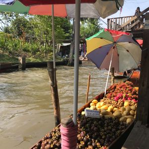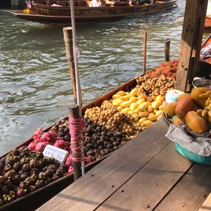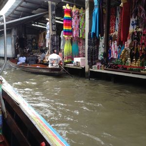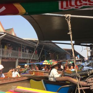 水上マーケットですが、とても込んでいて手漕ぎのボートにお金を払って乗ったのに、ボートが多すぎて身動き取れないくらい(船がこすりあって少しずつ動く感じです)でした。バスを降りて1時間後の集合時間でしたが、集合時間にも間に合わず、他の方々を待たせてしまっているかと思うと自分たちが悪いわけでもないのにひやひやしてしまい全然楽しめませんでした。(はじめの5分は写真撮ったり楽しかったのですが)ガイドさんの説明では30分くらいボートに乗って後は散策のはずでしたが、結果1時間もボートで身動きとれず散々です。周辺のお店も何も見れませんでした。