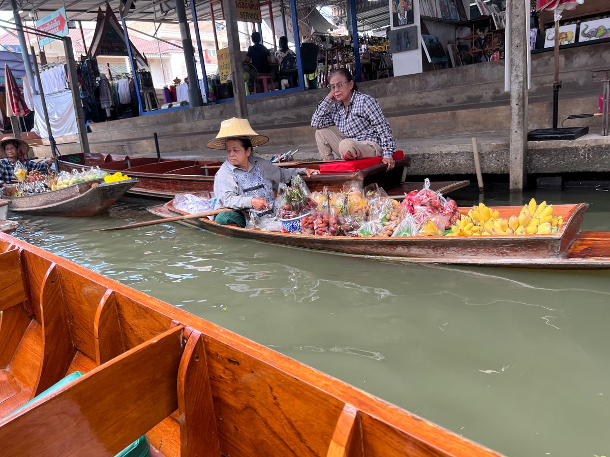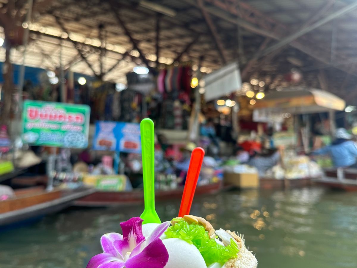 特に水上マーケットでの体験は凄くたのしかったです。200バーツの追加料金で乗れる手漕ぎボートを強くお勧めします。現地の方が操縦してくださる船に乗ってそのまま様々な工芸品や食べ物を眺めたり買ったりする経験は異国にいるのだと強く感じる瞬間でした。私は大蛇をクビに巻く体験と揚げたバナナ、ココナッツアイス、マンゴースティッキーライスを食べました!