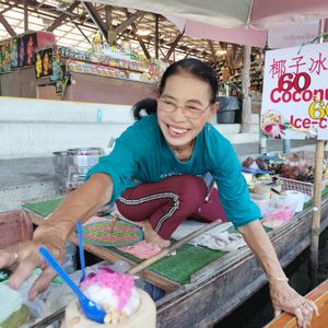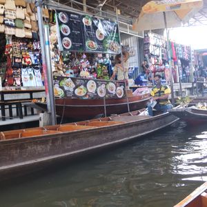 水上マーケットはエンジンボートで水上マーケットへ移動し、そこから手漕ぎボート(有料200THB/人)に乗り換え、水上マーケットを1周します。手漕ぎボートでゆっくりと進むのは雰囲気を味わえるので有料でも乗られることをお勧めします。またボート上でココナッツアイスを買って食べましたがとても美味しかったです。