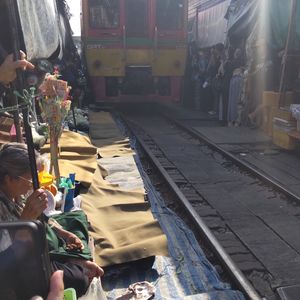 メークロン市場ではぎりぎりを通過していく電車のドキドキ感を味わい、市場で買い物も楽しめます。