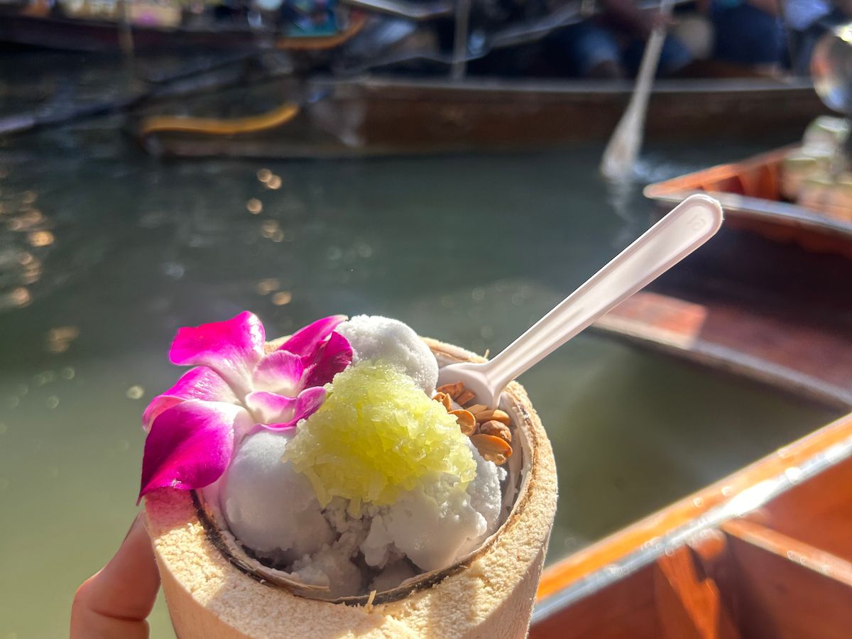 水上市場はボートで市場を遊覧しながら買い物したりココナッツアイス食べたりなど、これもとても楽しいです。ゆっくりと進むボートなのでお子様やご年配の方でも大丈夫です。