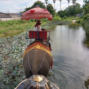 二人用のイスに座って象に乗ります。写真は少し大げさかもしれませんが、草茂る池の中にも入って迫力満点です。意外に揺れることが分かり、貴重な体験でした。水上マーケットは観光化されていますが、ボートに乗って独特の買い物気分を味わうことができます。また、バンコク郊外にあるので、道中のタイ田舎の風景も楽しめます。ガイドさんのお話も楽しかったです。