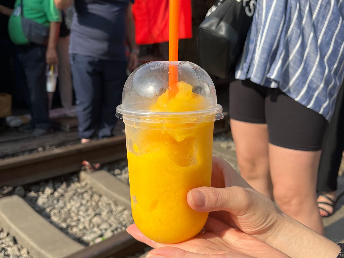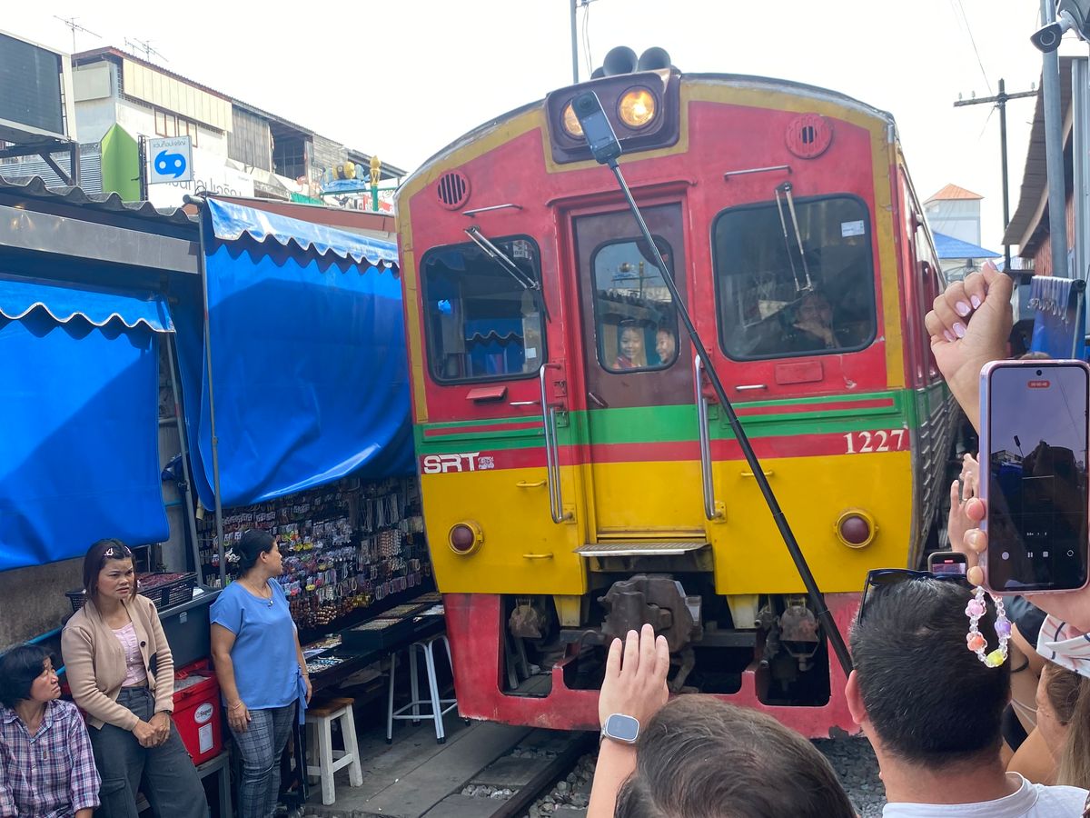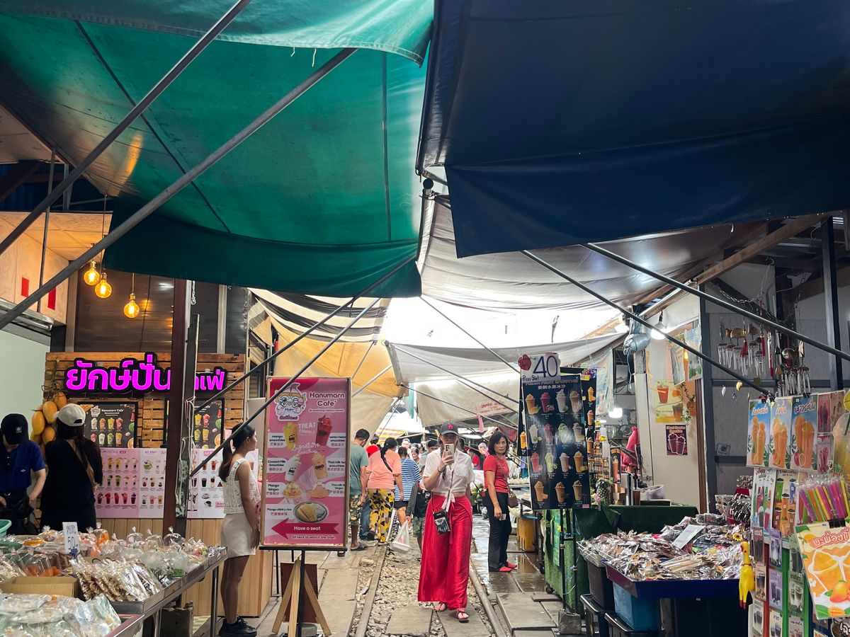 メークローン鉄道市場は、いろいろなものが売っていて楽しく、列車が間近に通った時はスリルがありました。