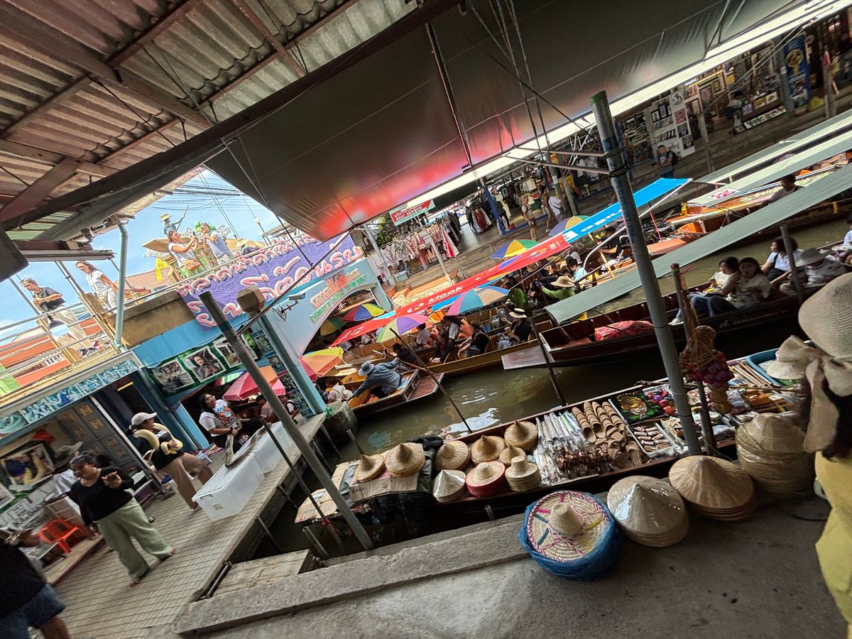 水上マーケットでは手漕ぎボートに乗り、ゆったり過ごしました。船が混んでいるところでは、船と船がギチギチ当たっても、船頭さんたちは平気で、そういうところもまた楽しかったです。私たちは体験重視だったのでボートに乗りましたが、買い物をしたり何か食べたりしたいのなら、ボートに乗らず、ゆっくりお店を回るのもいいと思います。