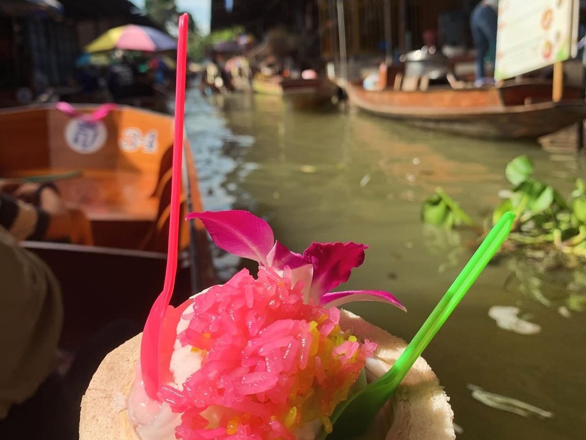 朝はバンコクのバークレイホテルに泊まっていたのでお迎えに来てもらえました!その後他の方のホテルにも向かいみんなでまずは電車が目の前を通る市場に行きました!ほんとに迫力があって一度は見てみたかったので嬉しかったです!次に水上マーケットに行きました!船に乗ったまま買い物できるのでおもしろいです!おすすめはココナッツアイス!ただ、マーケットまではお金はかかりませんが、マーケットにつくと船に乗って回る時にはお金200バーツ(約800円)かかりますので注意!