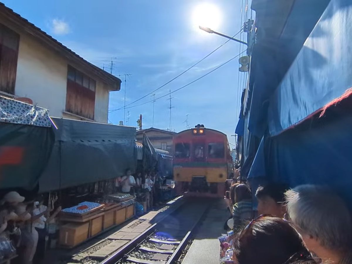メークロン鉄道市場では絶好の立ち位置を確保してくれて、目の前を列車がギリギリに過ぎて行くのを体験できました。観光客で大混雑のため、熟知していないとなかなか難しいと思います。