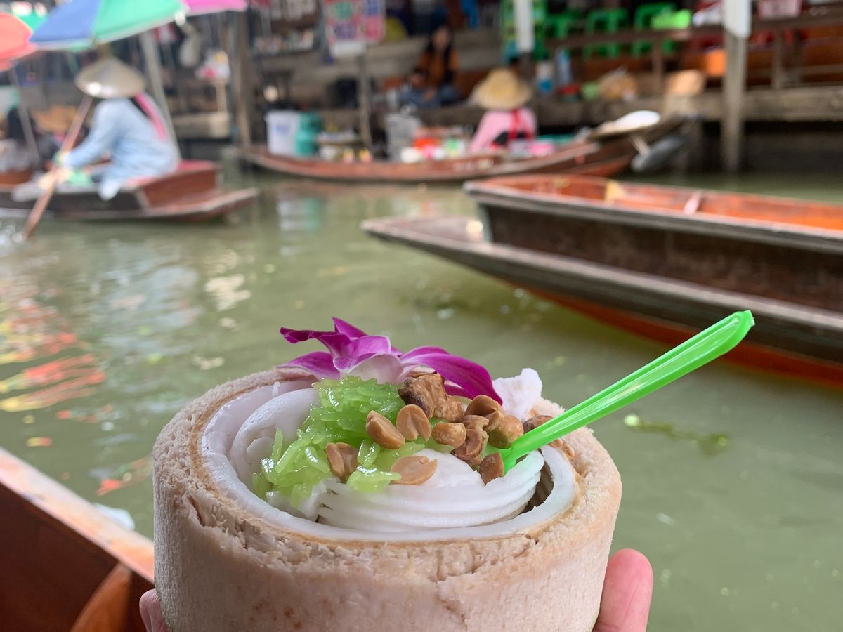 水上マーケットでは、とても心地よく楽しく、メークロン鉄道市場は、迫力ある電車の通過を目の前で見る事が出来、とてもよい体験が出来ました。市場で自由昼食だったので70バーツで安くて美味しいガパオライスを頂きました。カフェでは、ゆったりとのんびり過ごさせて頂きました。カフェメニューは豊富でした。解散場所のマーケットは、とてもキレイでお洒落なマーケットで楽しかったです。充実の1日を過ごさせてもらえました。ガイドのヤンさんは、日本語が上手でとても親切なのでで安心出来ました。
