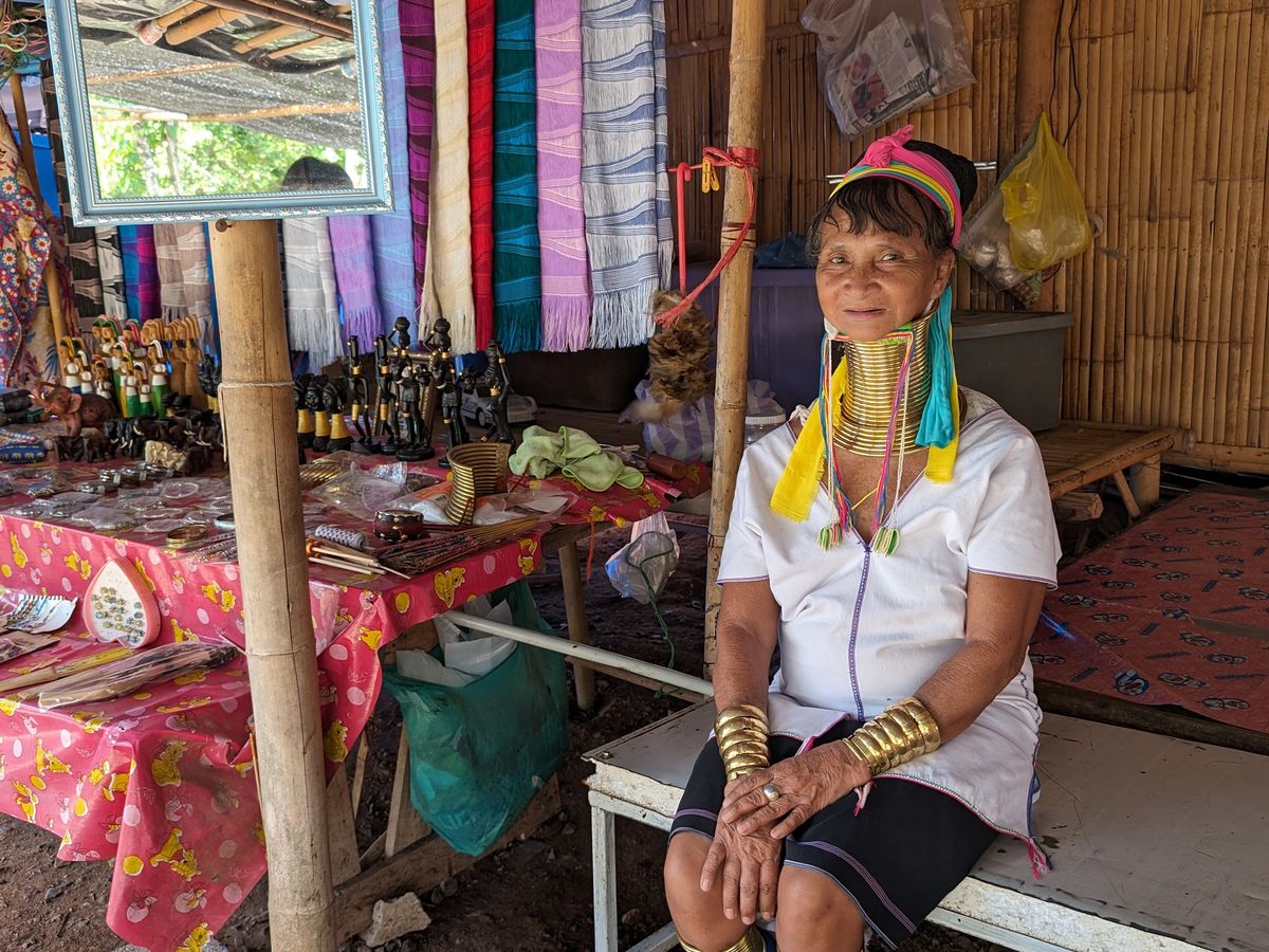 次にエレファントパークキャンプへ行き、私達は首長族に会いに、他の客達は象乗り体験へ行かれました。他に象のショー、ワニのショーなどあるようでした。トラと写真が撮れるみたいでしたが、ツアースタッフに確認するとそれはだめと言われました。首長族の集落は人数分の小さな小屋が丸く連なっていてそれぞれ自身が作ったストールなどの織物やアクセサリー、その他お土産物を売っていました。写真は自由に撮れます。お土産は全員の小屋で買うのはとても無理なのでちょっと申し訳なかったです。