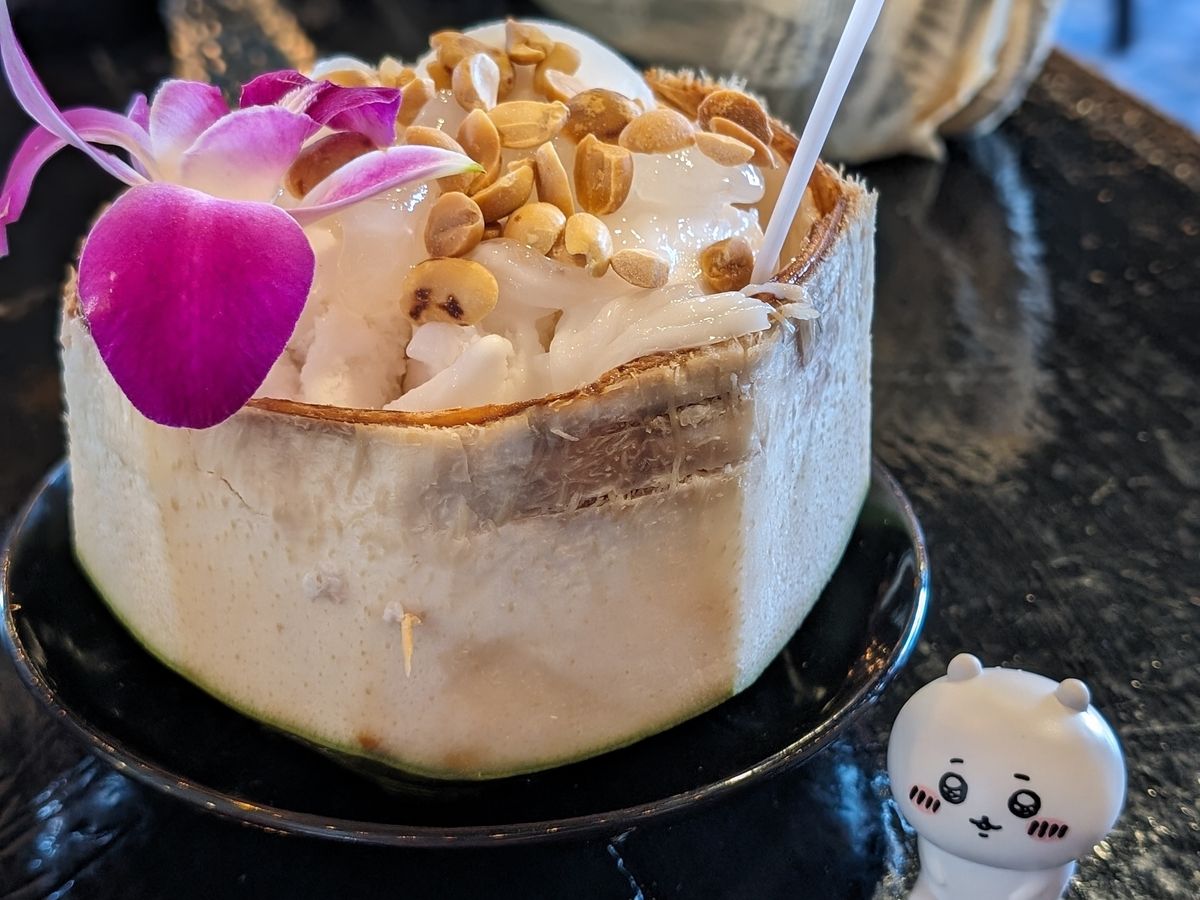 水上マーケットでは手漕ぎボートに乗るのが楽しいと思いますが、以前乗った事あったので買い物に集中しました。値切ることも出来るので楽しいです。空いた時間でカフェに入りココナッツアイスを注文しましたがそれも水上マーケット内で仕入れてきたみたいでした。暑い日だったのでとても美味しかったです。