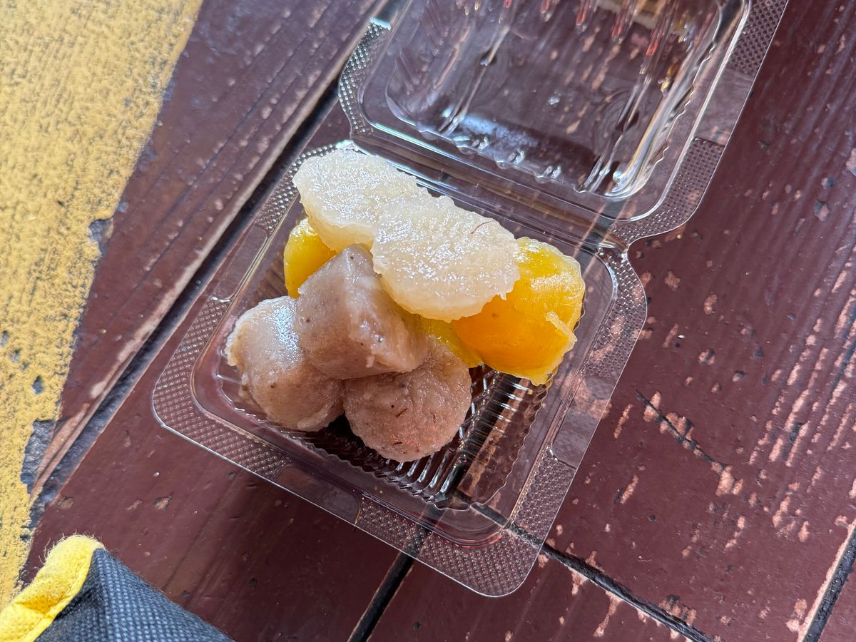 着いた先はノスタルジックな感じがして古き良き集落を感じました。歩いていると、お店の方から声を掛けられ、地元でとれた海産物、果物、そして地元のお菓子などが売られていました。見てみると、どれも気になる商品ばかりです。自由時間にツアーガイドの紹介でマーケット内の食堂で夕食をとりました。逆にお店を探すよりはありがたいと感じました。