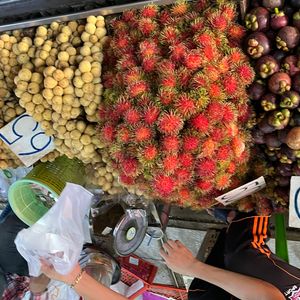 まずは、メークロン線路市場に向かいましたが、渋滞にもハマらず、快適でした。ガイドさんから、ランブータンを沢山差し入れをしていただき、美味しかったです。味はライチに似てました。