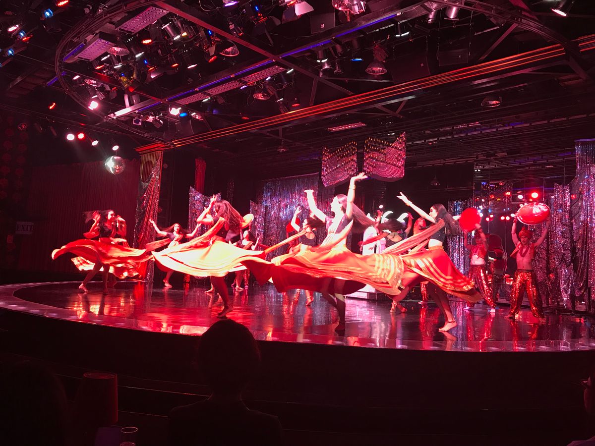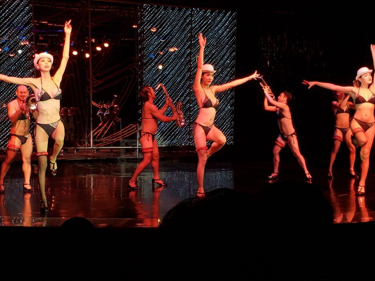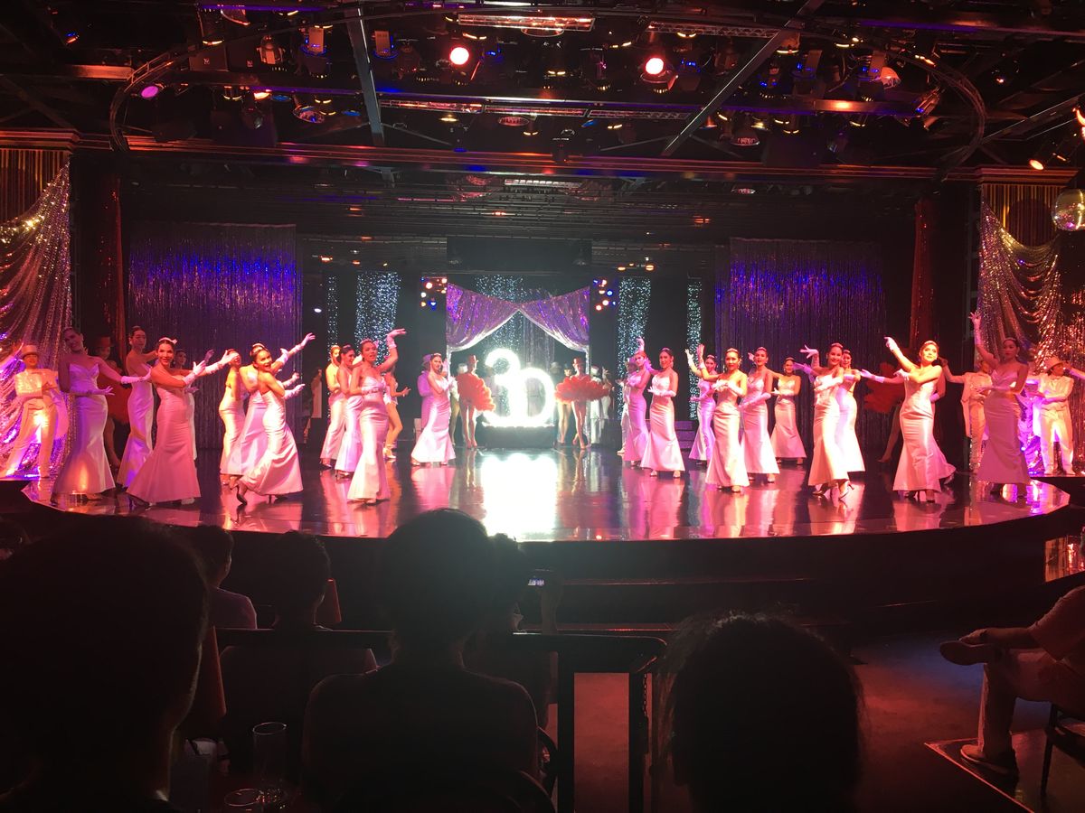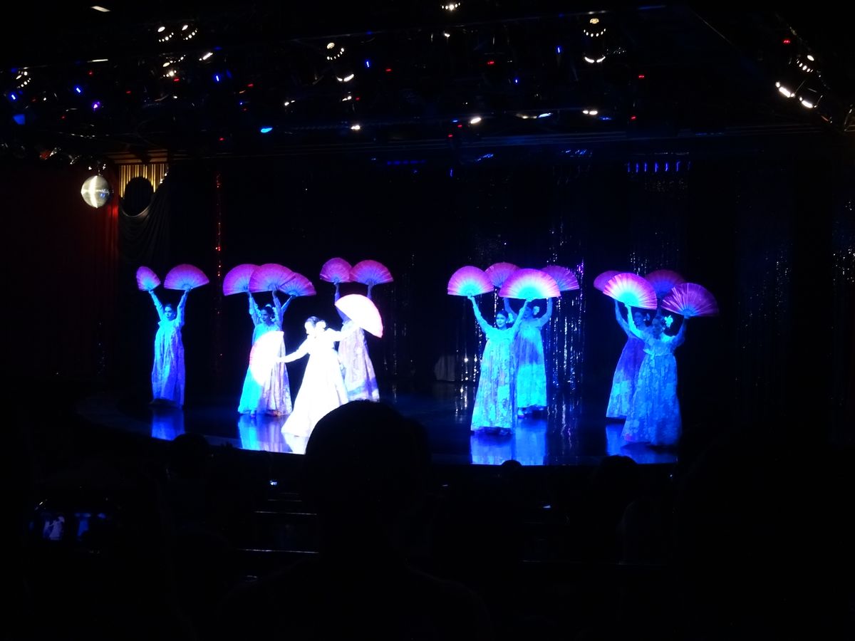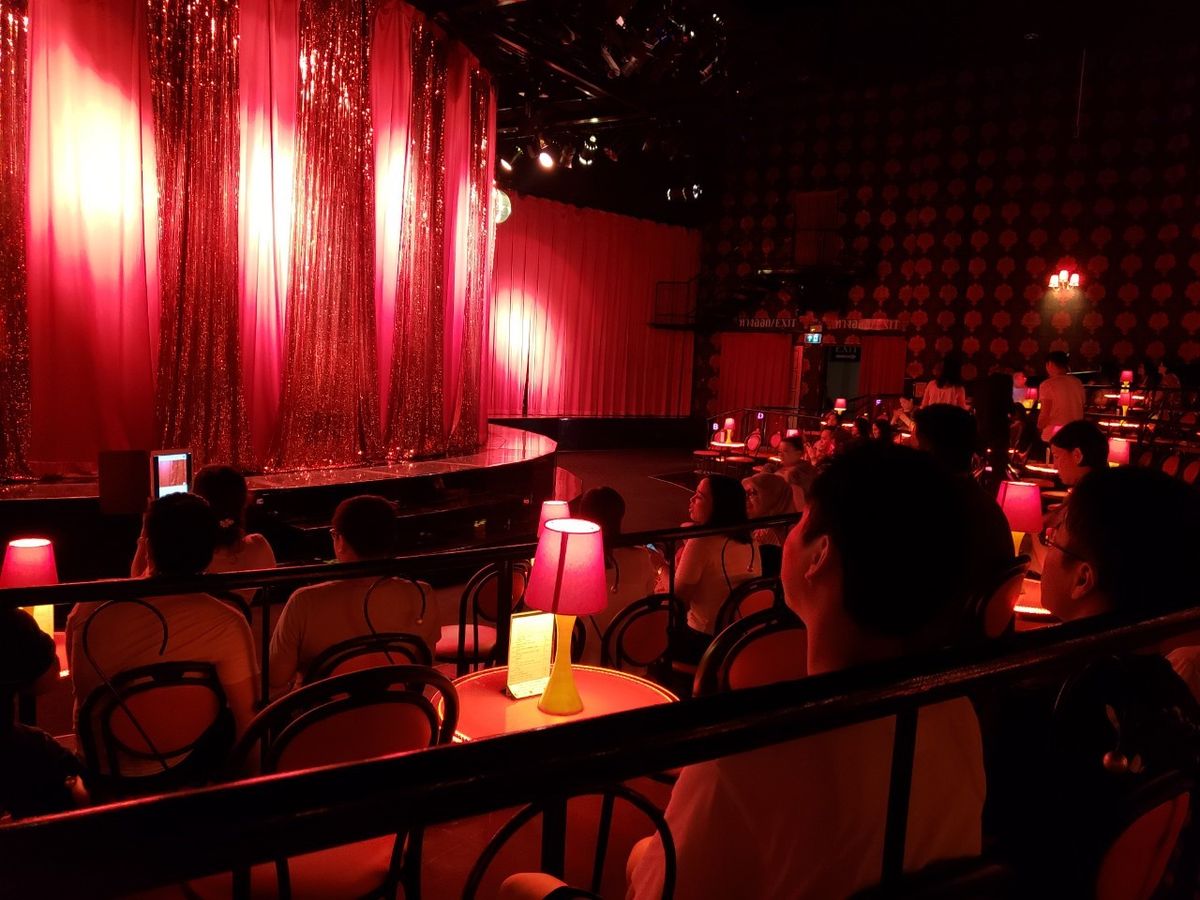 19時半のショーを見ました。GWということもあり日本人ばかり。座席はセンターでしたがR列で一番後ろの列でした。最前列はA。最前列から三列目くらいは、かなり見応えありでしょう。私達はニューハーフの方の顔もよくわかりませんでした。最前列の方達と同じ料金だと思うとガッカリ。現地でチケットを引き換えて、はじめて座席がわかります。国別のショータイムがあるのですが、日本は馬鹿にされている内容(着物を着たニューハーフがお笑いのようパフォーマンス)で少し腹が立ちました。中国や韓国は、とても綺麗で洗練されたパフォーマンス!ショー自体は綺麗でした。座席次第で満足度が、かなり違うでしょう。