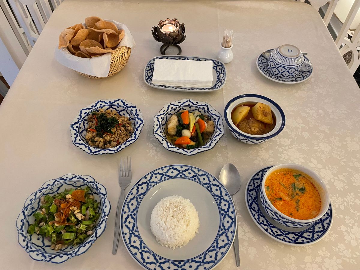 タイ古典舞踏ディナーショーでは、タイ料理を食べながら踊りを見ました。お料理は辛いものが少なく、野菜類が多くて、食べやすくておいしかったです。踊りの方達と写真がとれてよかったです。