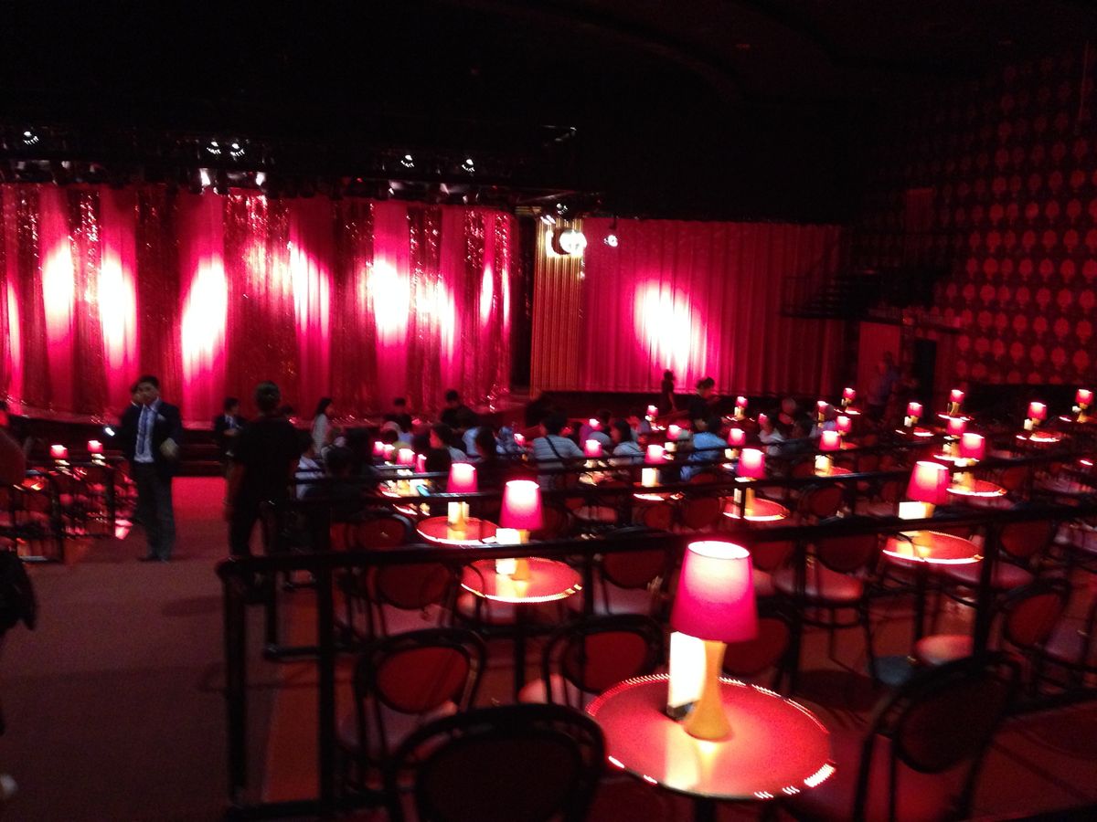 会場は赤いネオンでキャバレーらしいいい雰囲気、ショーを待つ間ドリンク(フリー)を飲みながら過ごしていました。