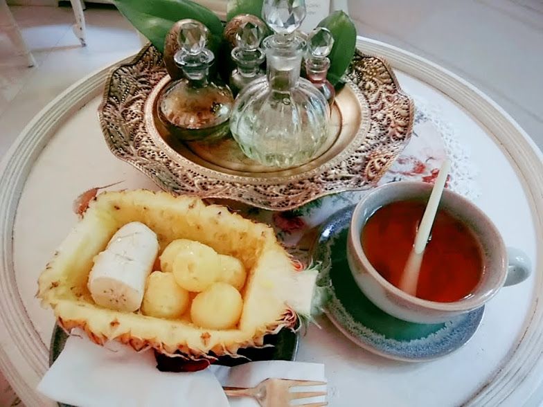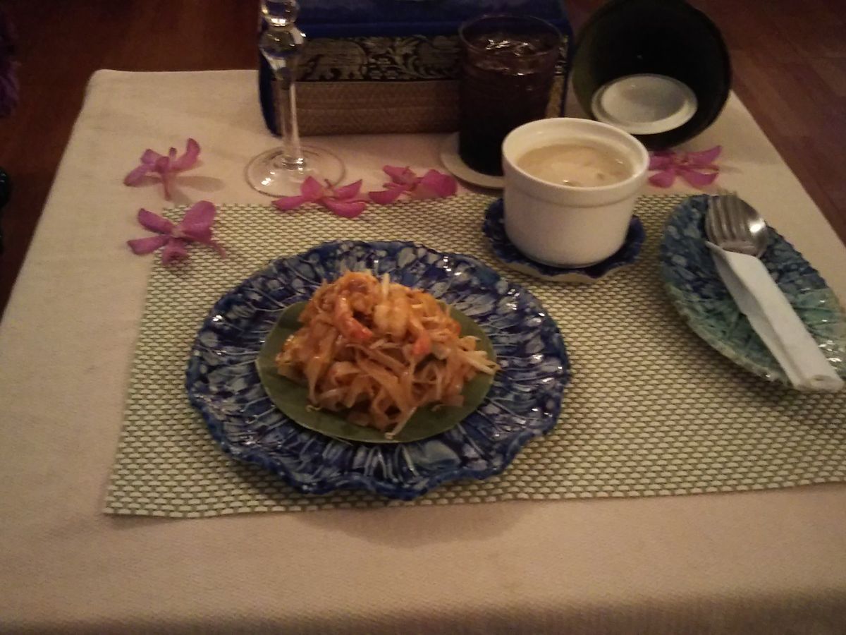 途中でパッタイとスープとお茶が出ますので、食事をいつ出して欲しいか最初の受付で聞かれます。お昼がまだだったので1時ごろ出してもらいました。果物やお茶なども出ます。本当に天国のような時間が流れますので、騙されたと思って是非5時間コース選んでみてください。