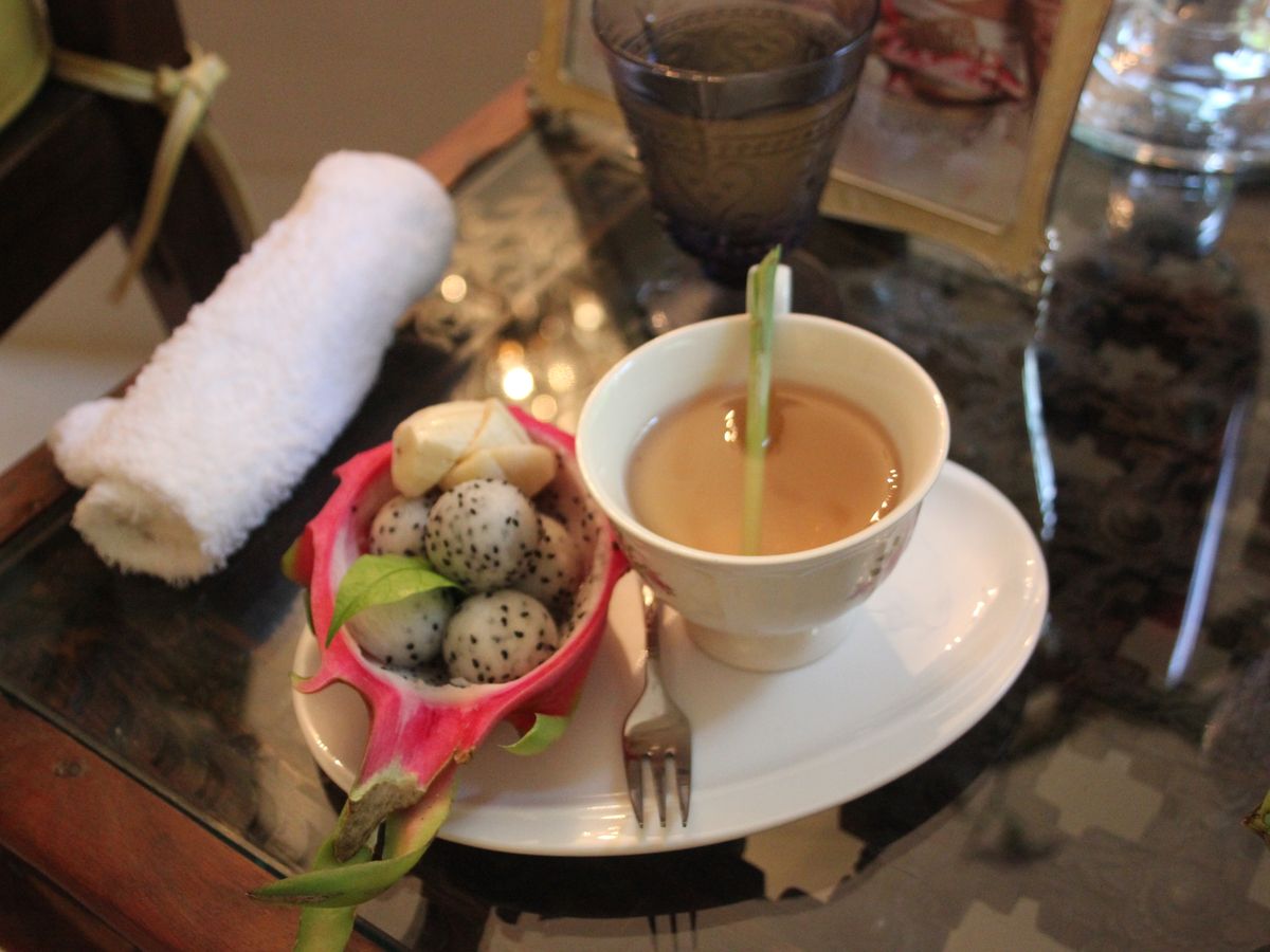 オイルマッサージの後のハーバルボールで暖められると体が ホッとします 施術のあとの フルーツも楽しみのひとつで 今回はかわいく盛られたドラゴンフルーツでした。