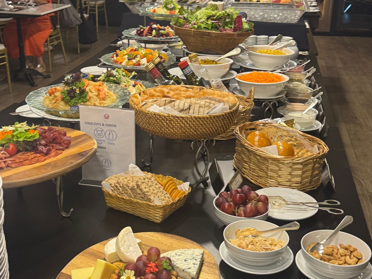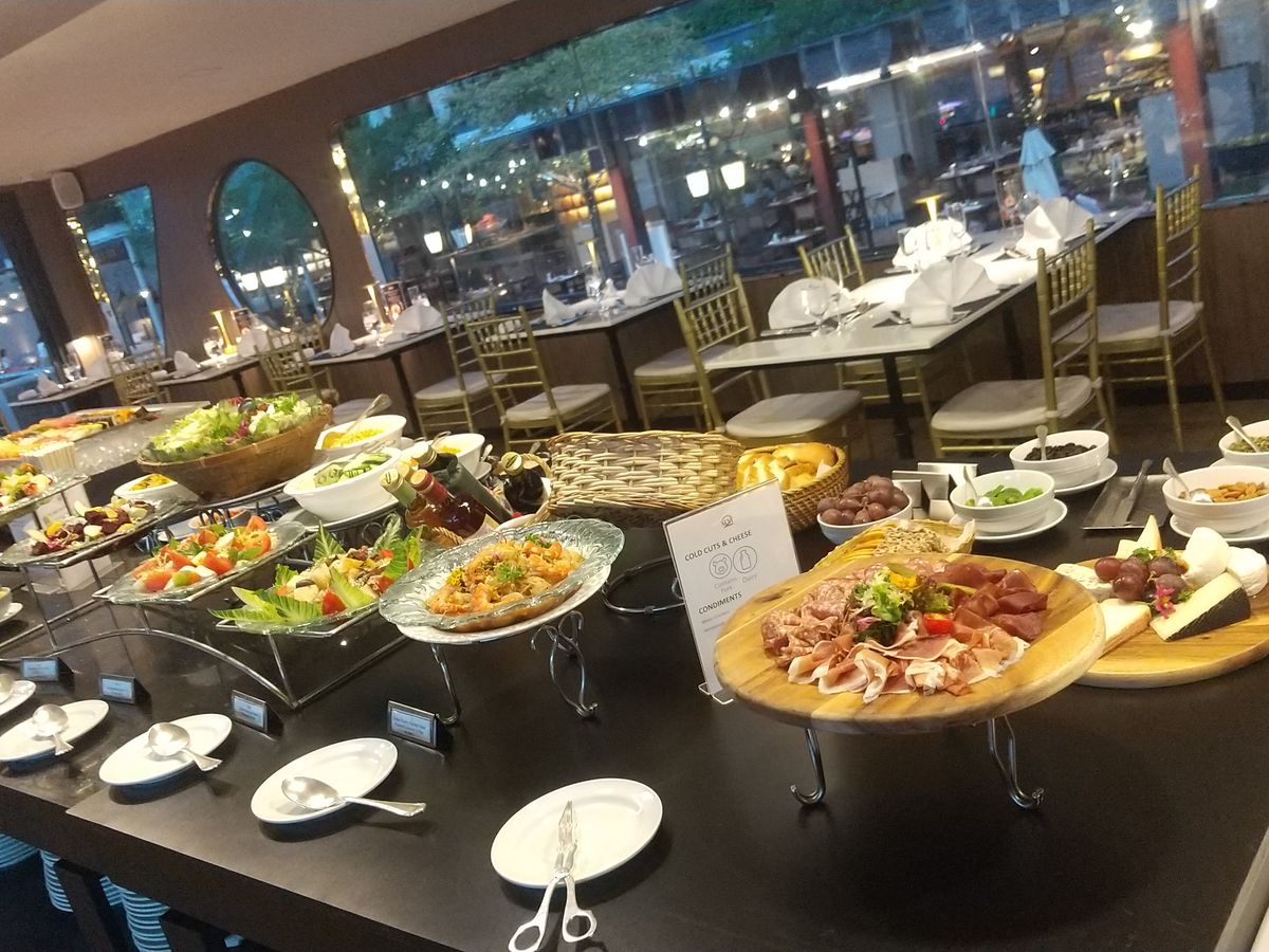 食事はローストビーフなどの肉料理、蝦・蟹・ムール貝、刺身・寿司、何種類ものタイカレー、チーズ等々質量ともに十分で、且こまめに補充されていたのでゆっくりと楽しめました。