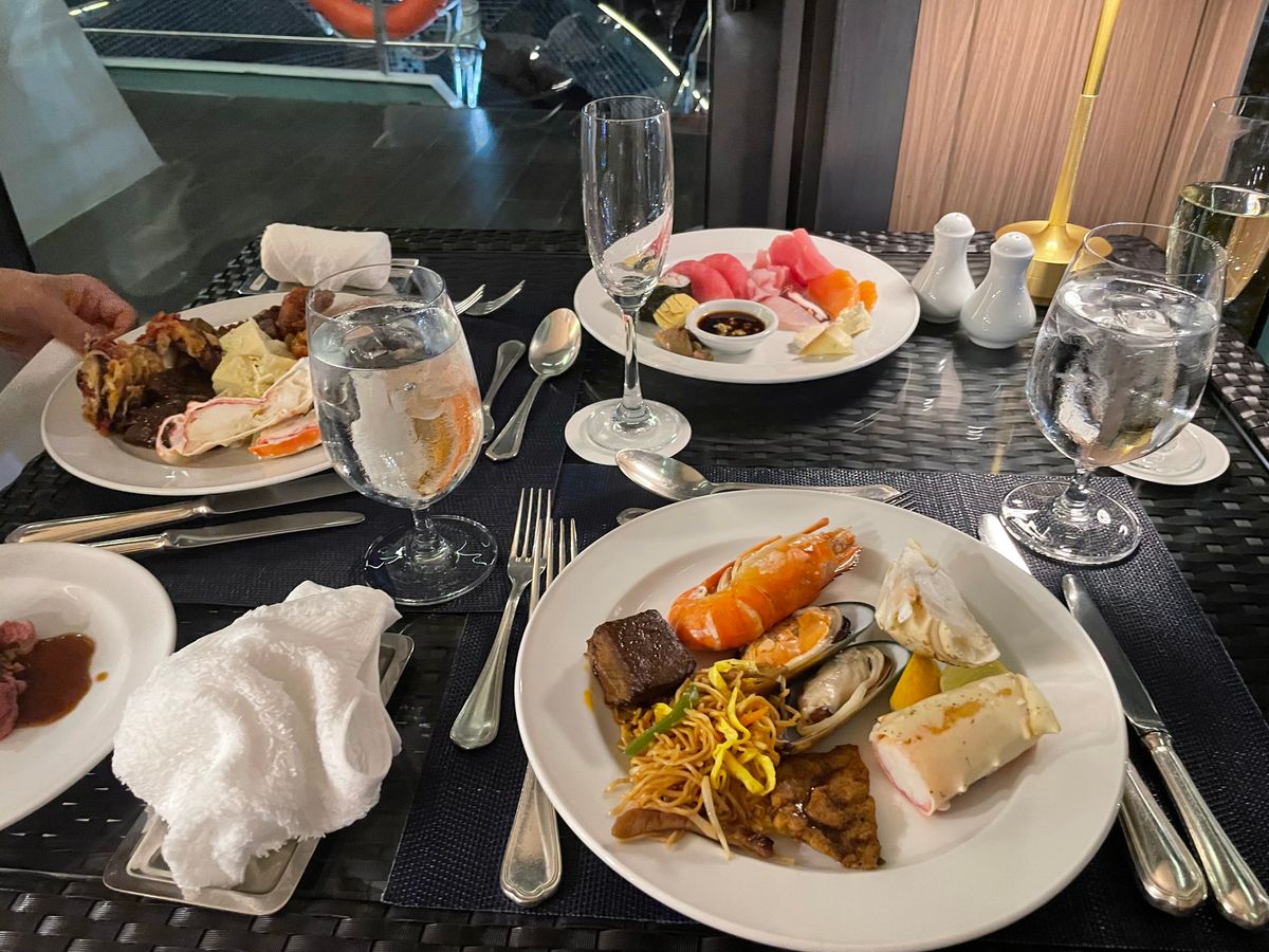 アイコンサイアムでプリンセス号に乗船する前もサックスの演奏などでお出迎え!カッコよくてワクワク!ディナービュッフェは混雑で思うように取りに行けなかったな。演奏と歌がチャオプラヤ川のほとりの寺院などのライトアップとあって素敵でした。ディナービュッフェはいろんな国の方々が割り込みもあり、子供達は取りに行きにくくお料理メインに期待せずにです。ノリの良い音楽で最後のほうはみんなで踊ってクラブのように盛り上がってプリンセス号のデッキで風もあり夜景も綺麗で最高に楽しかったです!女性の歌と男性のサックスのセッションも上手くてみんな席を立ち上がって踊ったりで荷物などは気をつけたほうがよいです。