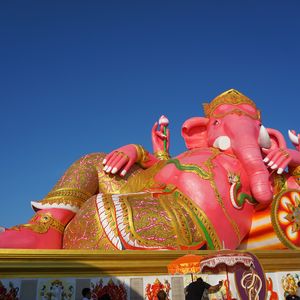 次には1度行きたかったピンクガネーシャのある「ワットサマーン」へ。ガイドさんがていねいに説明をしてくださり、ここでもたくさんのお願い事ができました。ヒンズー教のピンクガネーシャ以外に、仏教やバラモン教の像もあるテーマパークのようなところで、食事の屋台も並んでいました。