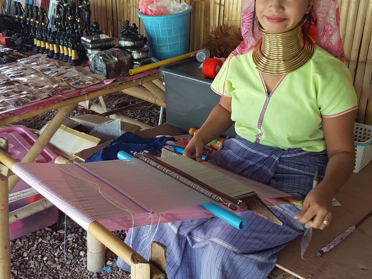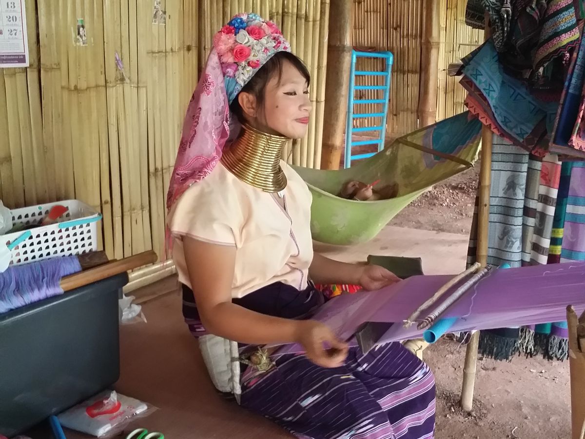 そのあと首長族の居るテーマパークのようなところに行きました。10人ぐらい?首長族の方がそれぞれの小さな家の前で機織りをしています。テーマパークの係の人に、最初に首長族の方と私をツーショットで写真を撮ってもらって、あとは自由にうろうろします。ストールを200バーツで売ってたりしますので、最初の首長族の方以外の方の写真を撮るのであれば、何か民芸品を買うほうが良いと思います。何も購入しなくても写真を撮っても良いと思いますが、見世物みたいになってしまうので、民芸品を購入+ご自身とツーショットで撮るのがマナーかな、と感じました。同じテーマパークの中には象乗り体験があり、同行された観光客の方たちはそちらを体験されてました。