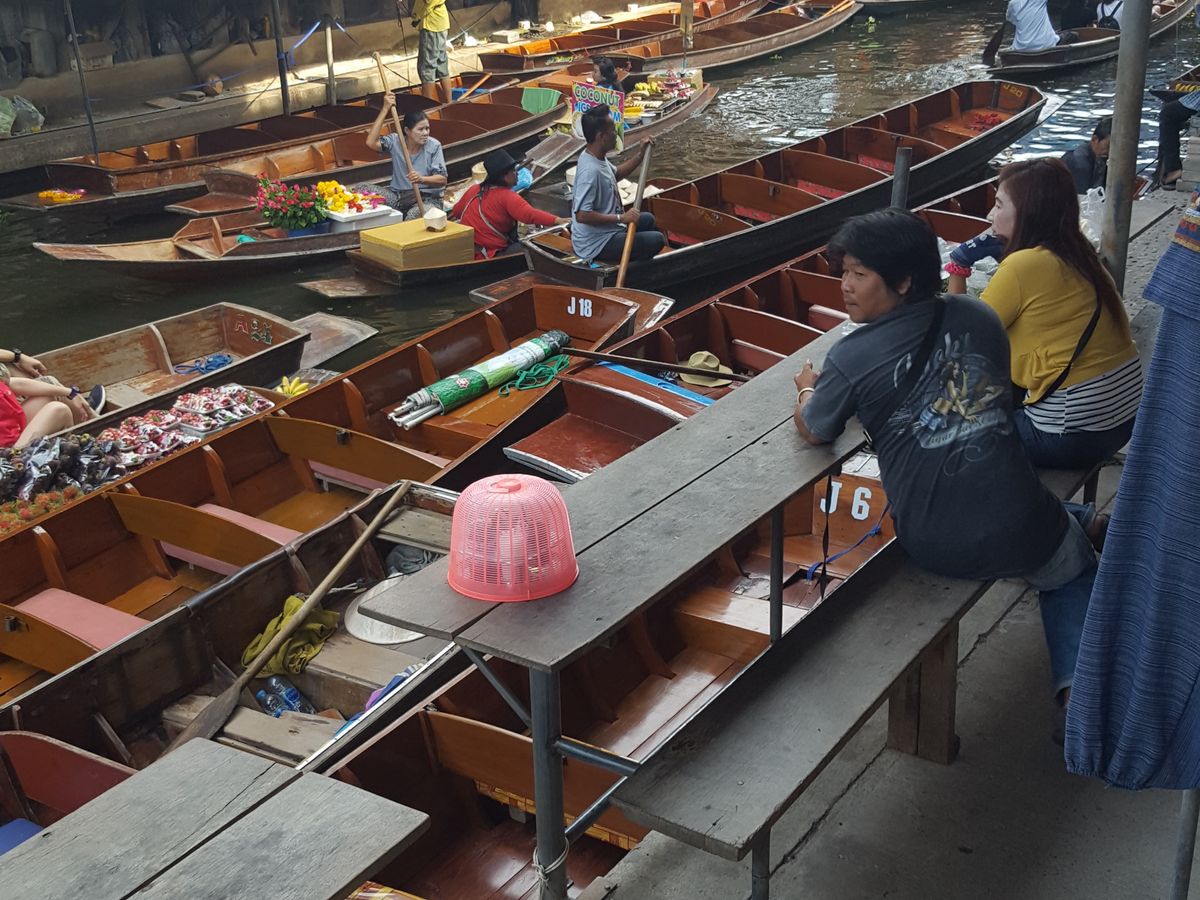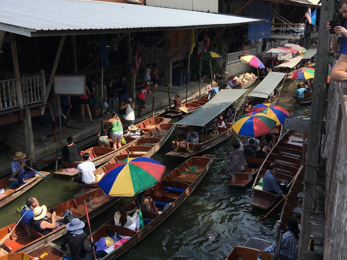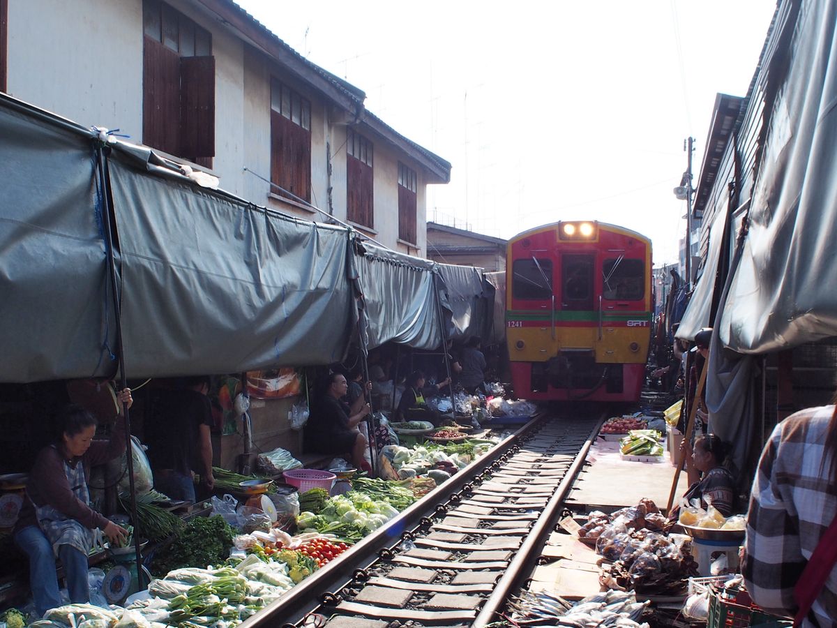 市場までのアクセスや列車の時間が限られている事を考慮してツアーに申込みしました。行きの道で事故渋滞がありましたが、ドライバーさんが急いでくださり列車の時間にうまく間に合い、ベストポジションで迫力ある通過を体験できました。水上マーケットでは、せっかくの機会なので有料のデッキボートに乗るつもりでしたが、マーケットへ行くためのモーターボートでかなり堪能できたので、マーケットでは陸上から横付けしている船のフルーツを買ってベンチで食べました。平日でしたが添付写真のようにたくさんのデッキボートが出ておりマーケットが窮屈そうに感じました。途中ココナッツマーケットへ立ち寄り見学時間がありました。タイラーメンは麺とスープを好みでチョイスできたので、日本では珍しいピンク色の甘酸っぱいスープのイエンターフォーをいただきました。女性のガイドさんが屋台で旬の大きなザボンを買って一粒ずつ食べさせてくださったり、濃く楽しい時間となりました。