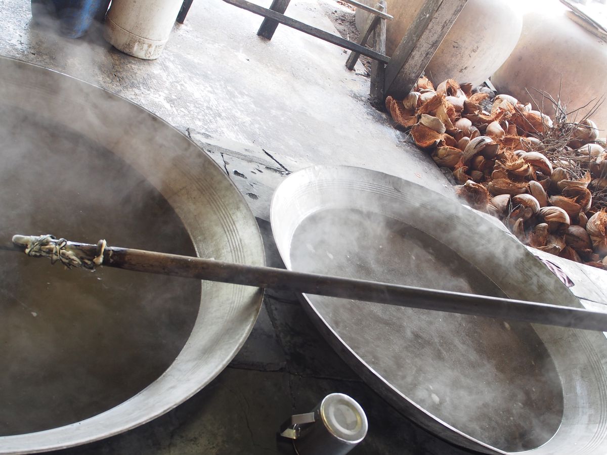 当日、ホテルでピックアップしてもらいココナッツファームへココナッツにも色んな種類があり美味さも違いがあると説明、出来立てのココナッツシュガーを試食、ココナッツミルクとは違う味わい!