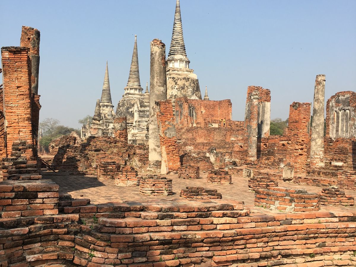 バンパイン宮殿は広々としてあちこちにお花が咲き、とても美しく、タイ建築、フランス様式の建築、中国の建築の中を見ることができ興味深かった。ガイドさんは各所で詳しく説明してくれたので当時の王様の離宮での生活が想像できた。アユタヤ遺跡のワット・マハタート、ワット・プラシーサンペットではビルマに破壊されて崩れかけている遺跡の中を歩き、歴史の中へタイムスリップしたような気分になった。崩れかけているレンガの遺跡は上っていいところといけないところをガイドさんが教えてくれ、これから先もこの遺跡を守っていくのは大変なことだと感じた。ワット・ヤイチャイモンコンもスケールが大きく見ごたえがあった。狭いレンガの階段を上まで登り降りてくると足がガクガクだった。
