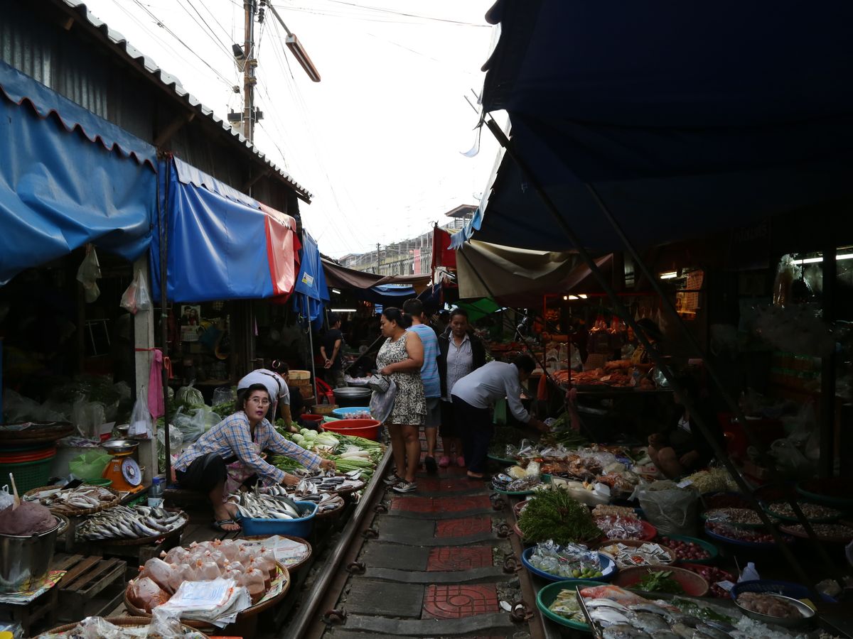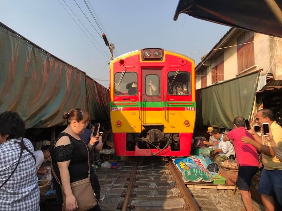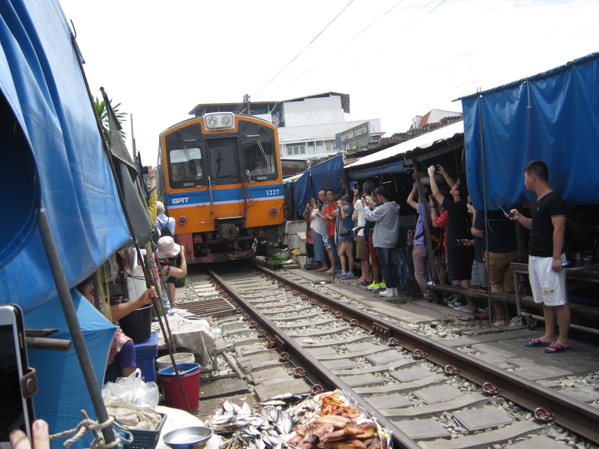 鉄道マーケットは迫力満点。私たちは露店に潜り込んでそこから列車の通過を見たのですが、目の前を通る電車に感動しました。私たちはシンガポールからだったので、野菜や果物(マンゴー)なども買い込み、途中小腹が空いたので屋台で食べ物を買ったりと楽しかったです。その後のココナッツファームは観光客プライスだったので何も買わず。かなり交渉できるとおもいます。(チャトチャックなどの4倍はふっかけてたかな)
