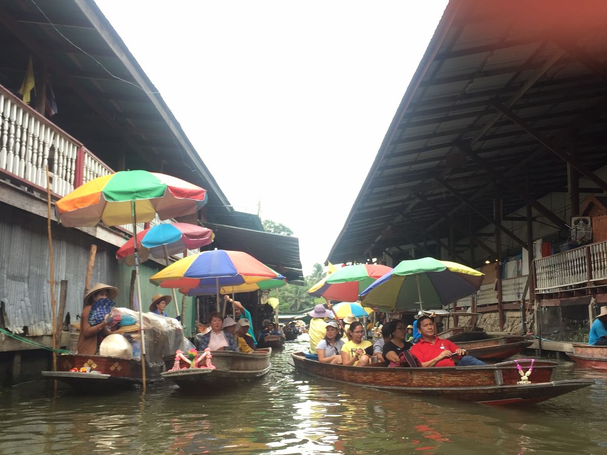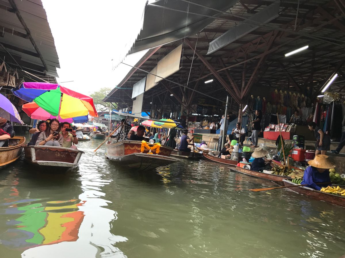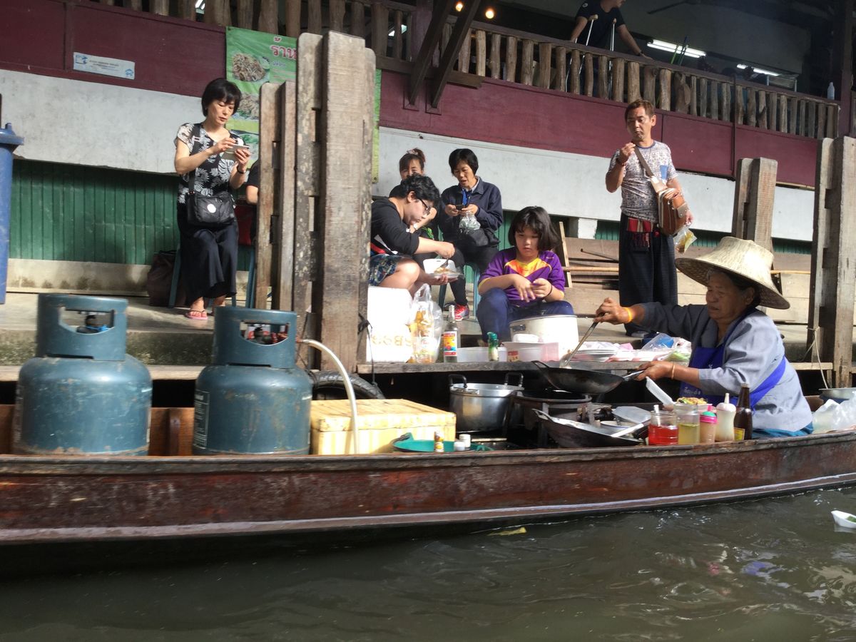 続いて水上マーケットに移動。こちらも観光客で大混雑。まずはエンジン付きボートで移動し、 200バーツの追加料金を払って手こぎボートに乗ることに。1時間待ちでようやく乗り込み出発。物売りの船が密集している間を手漕ぎボートでゆっくり、というはずが、観光ボートが密集し、怒号が飛び交う水路をゴリゴリ進む。ちょっとイメージと違います(星マイナス1)が、それなりに楽しい。