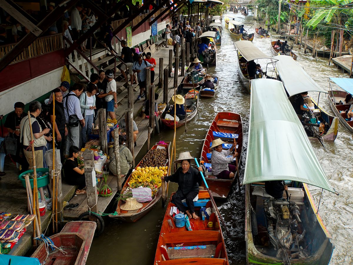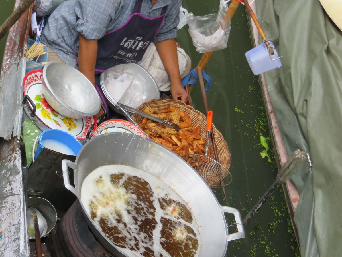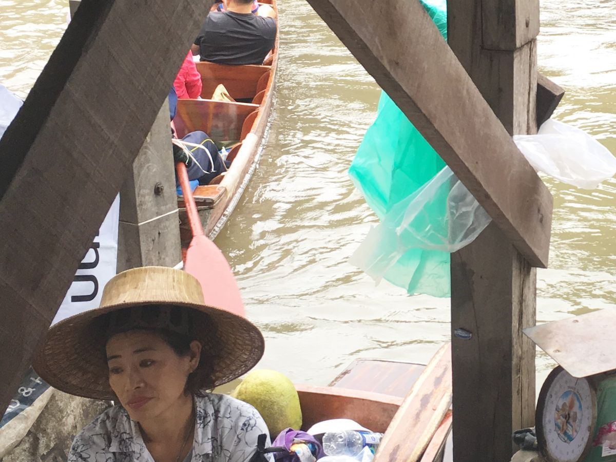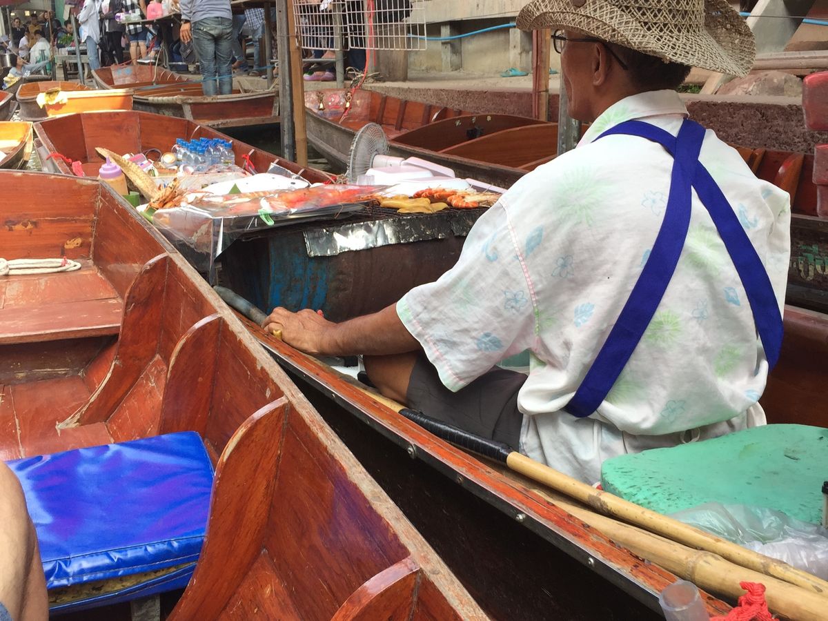 続いて水上マーケットに移動。こちらも観光客で大混雑。まずはエンジン付きボートで移動し、 200バーツの追加料金を払って手こぎボートに乗ることに。1時間待ちでようやく乗り込み出発。物売りの船が密集している間を手漕ぎボートでゆっくり、というはずが、観光ボートが密集し、怒号が飛び交う水路をゴリゴリ進む。ちょっとイメージと違います(星マイナス1)が、それなりに楽しい。