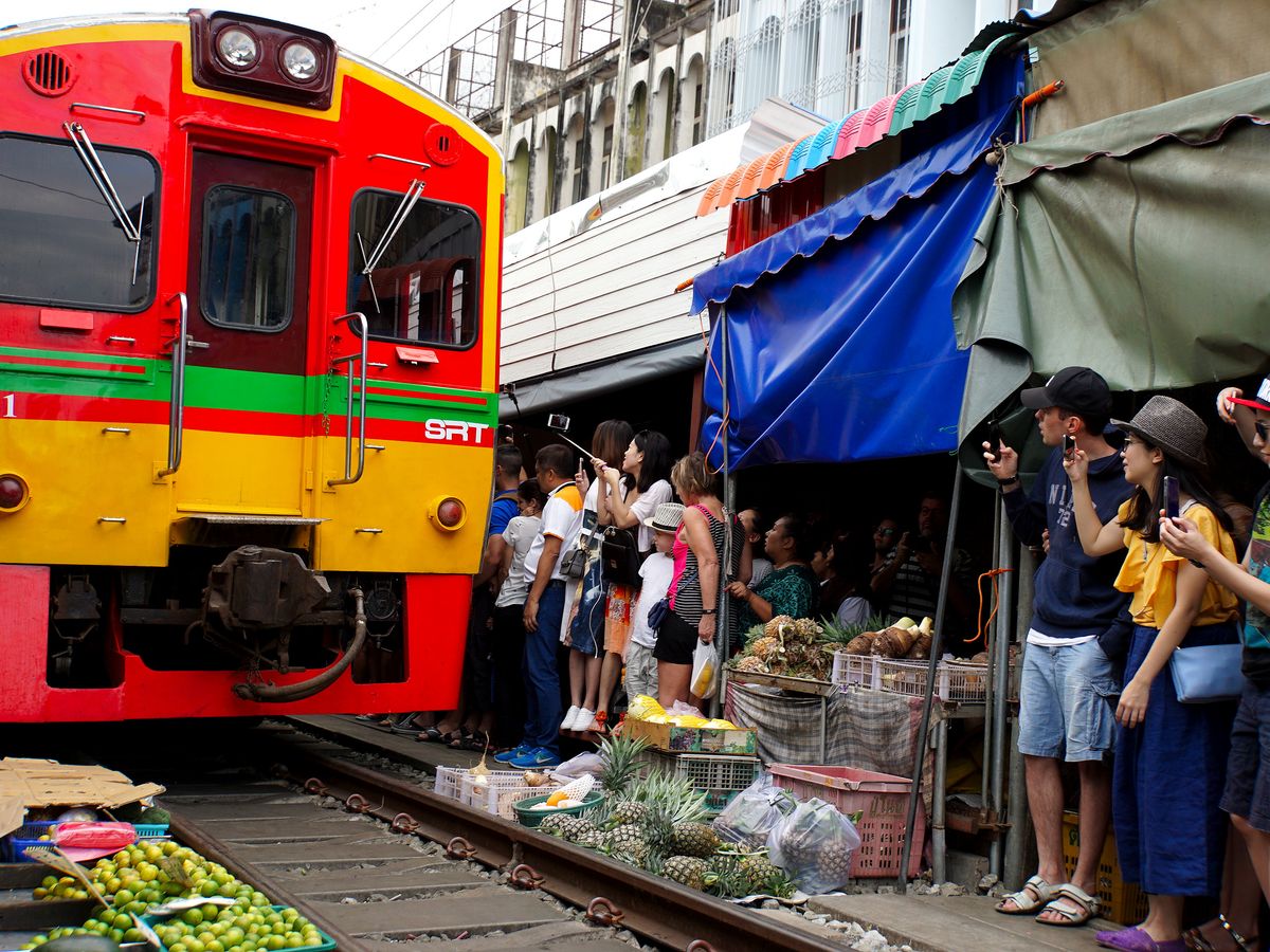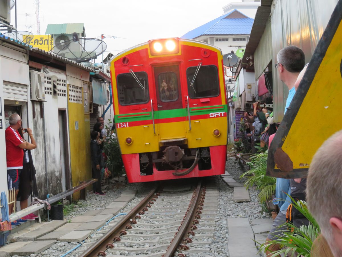 まず、メークロン市場に到着し、市場を散策。観光客が集まり出し、電車通過時刻になり警笛が聞こえると、ツーリストポリス的な人たちが線路から離れるように指示。その直後に電車がギリギリを通過。迫力満点。