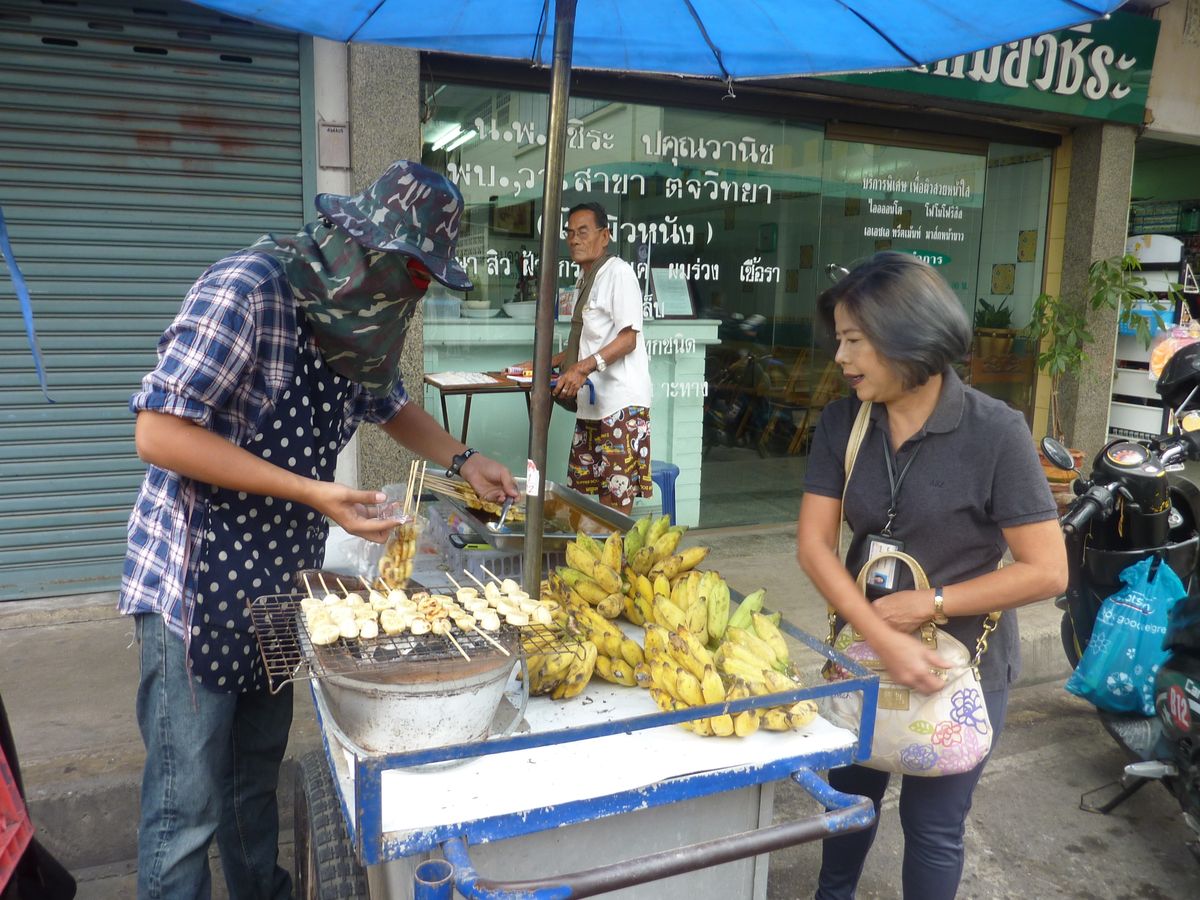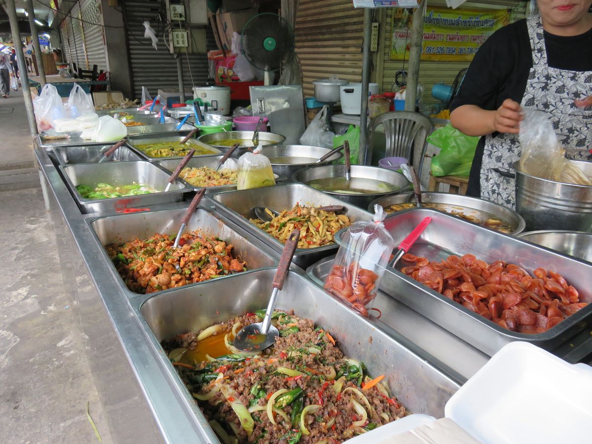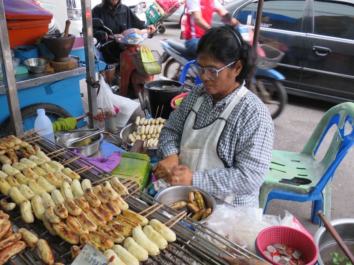 線路市場と平行に走っている道路にもソンテウやバイタク相手の安いお店や露天が出ておりスイーツから焼き鳥、ツクネ風フランクの串焼き(スパシーな肉にくしさで、アロ~~イ)