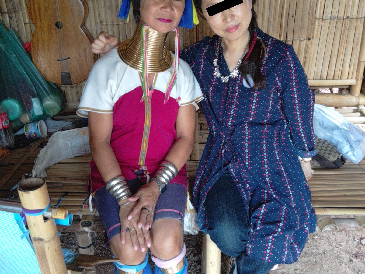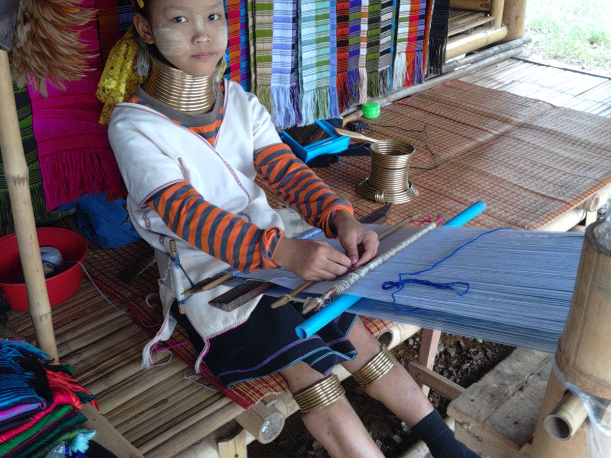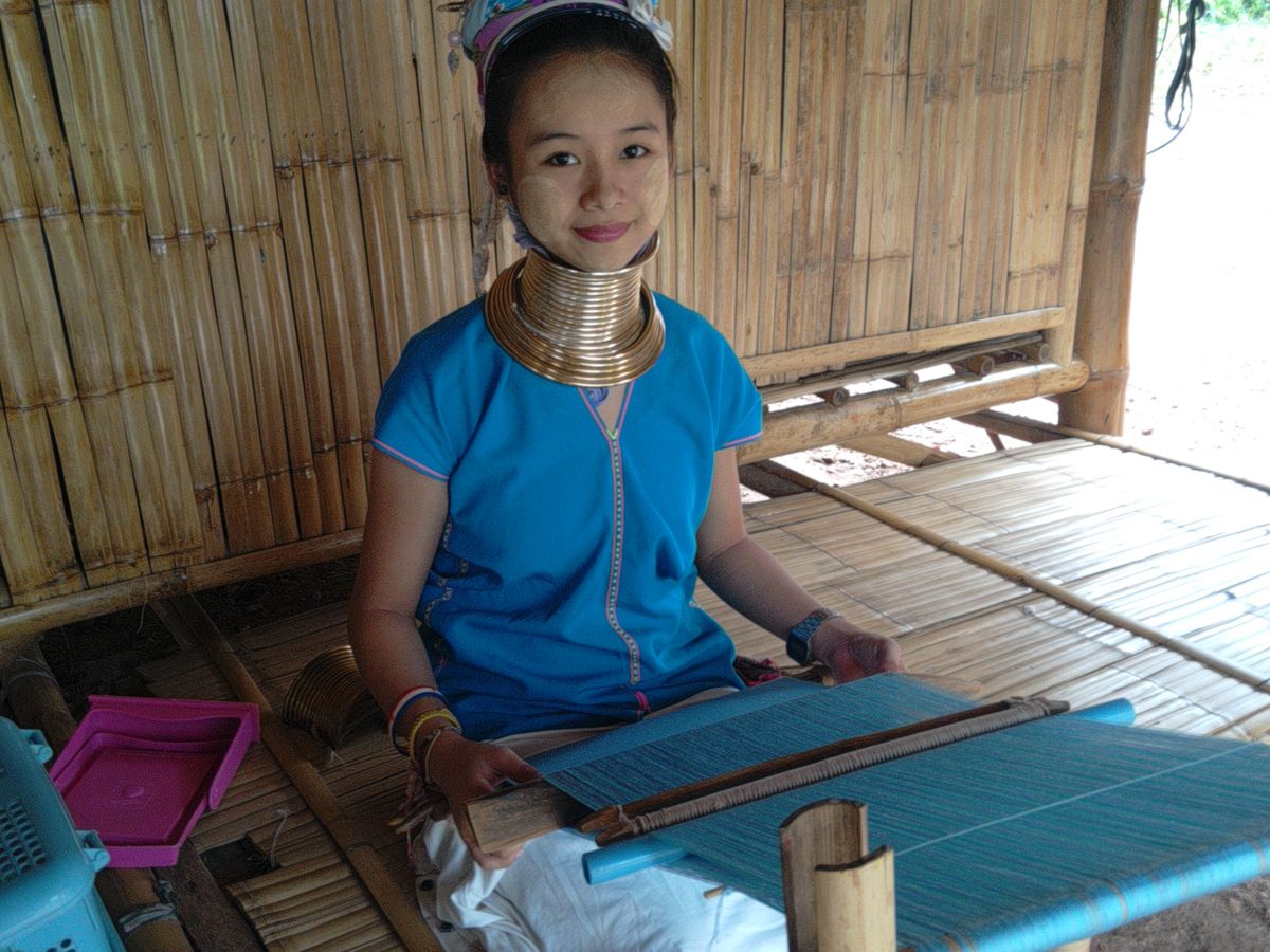 小さなテーマパークのようなところですが、観光客は少なめで閑散とした雰囲気で、10数軒の小さな小屋にそれぞれ首長族の女性がいて、織物をしながら土産物を売っています。