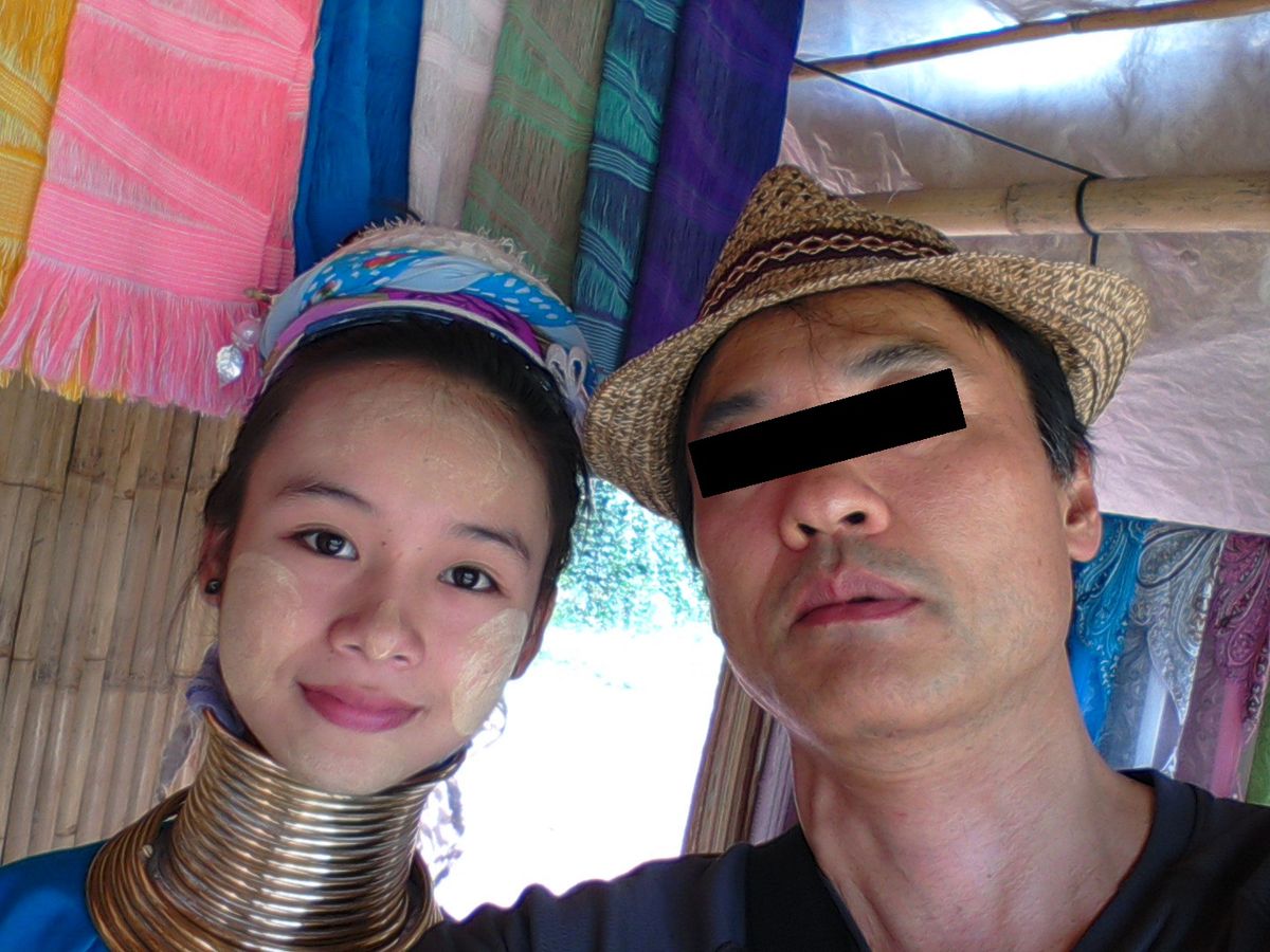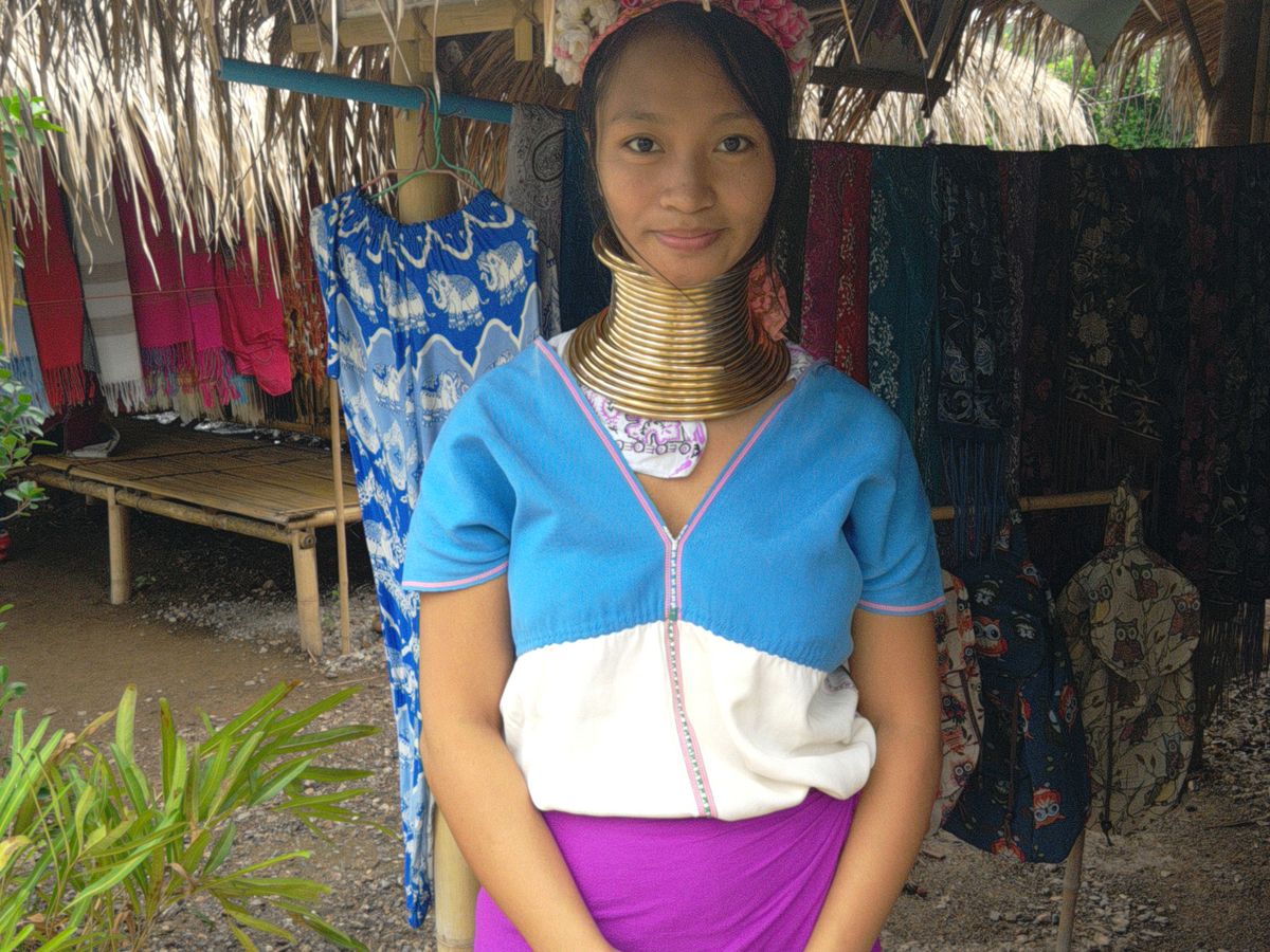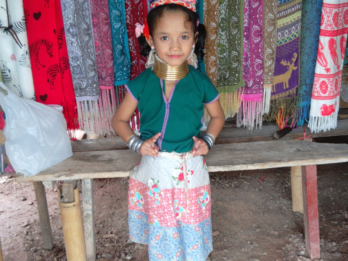 小さなテーマパークのようなところですが、観光客は少なめで閑散とした雰囲気で、10数軒の小さな小屋にそれぞれ首長族の女性がいて、織物をしながら土産物を売っています。