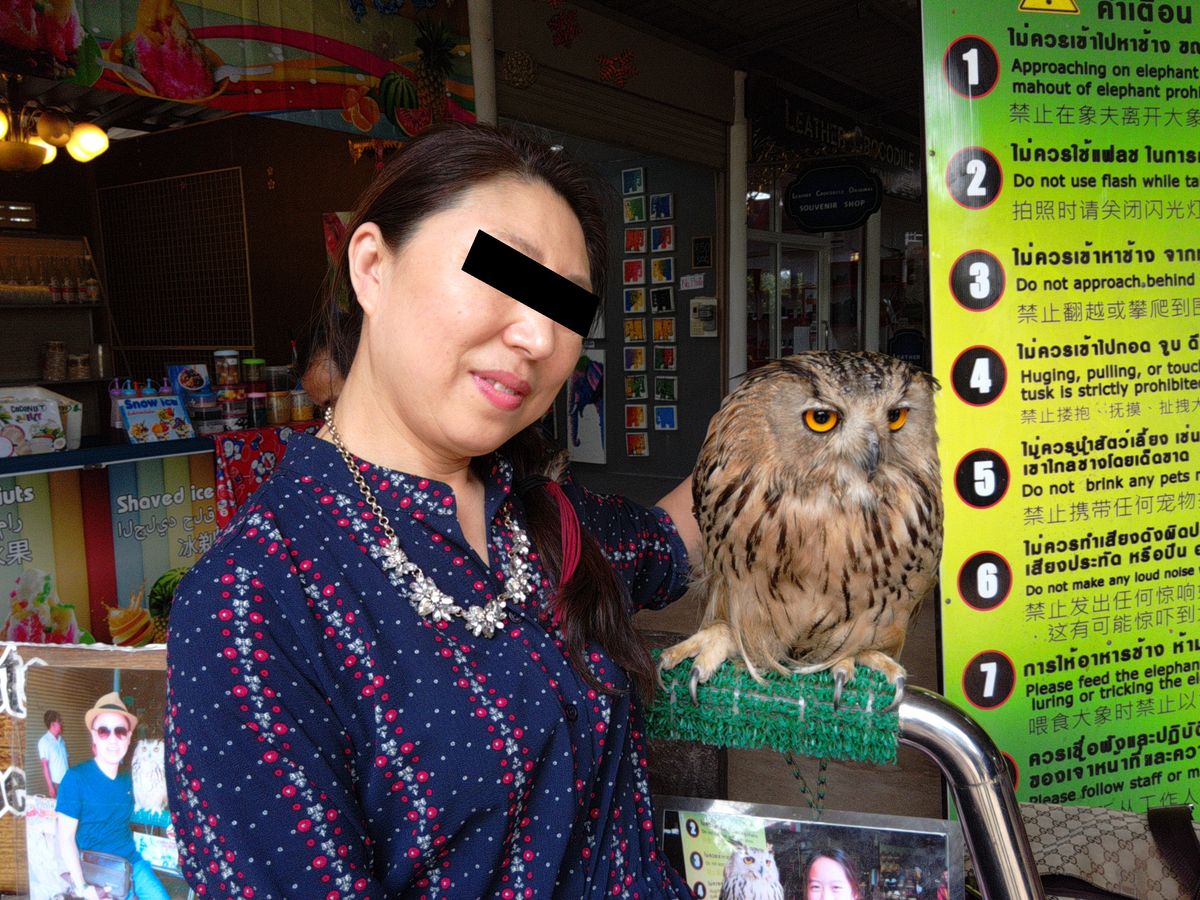 また、施設の入口には像やフクロウがいて、100バーツを払えば記念撮影ができます。