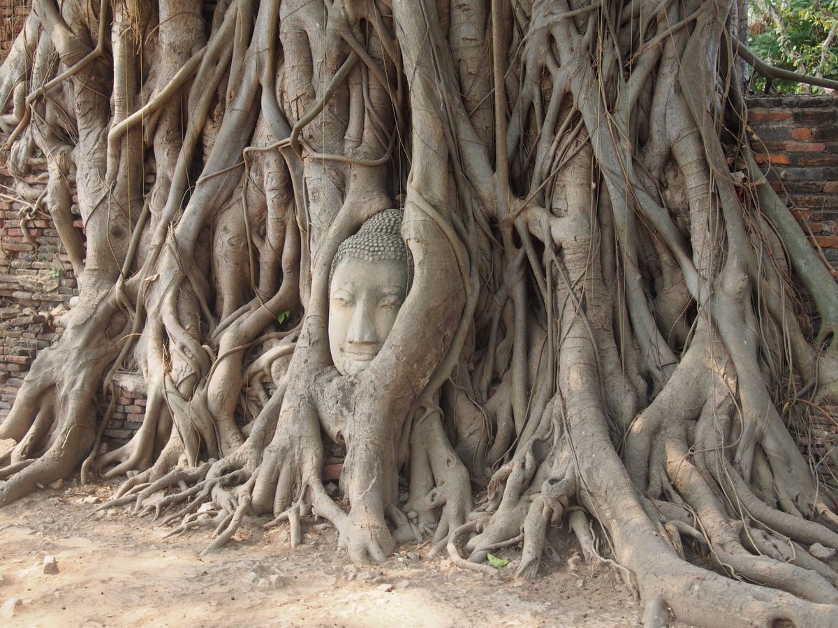 ツアーは、ワットヤイチャイモンコン、ワットマハタート、ワットプラシーサンペットの3つの寺院遺跡と象乗りが組まれた半日観光ツアーでしたが、半日の割には内容の濃いツアーでした。ガイドのエッグさん(本人が卵のエッグと覚えてくださいと言っていたが、本当の名前は忘れてしまいました)は日本語が上手で、「観光地は盗難に注意してください。ここは東南(盗難)アジアだから」とジョークを飛ばしたり、釈迦牟尼仏と涅槃仏の違い(釈迦牟尼は東を、涅槃仏は西を向いている)や、それに関連して寺院の正面玄関は東側にあることや日本で忌み嫌われている北枕がここタイでは西枕であるということなど色々と教えていただき、大変勉強になりました。中でもワットマハタートは仏塔、仏像が破壊され、盗掘にあっている中、遺跡本体より、木に囲まれた仏頭(仏頭を盗もうとした人が途中で重くて置いていったという)の方が皮肉にも今では有名になってしまったという解説が大変印象的で、どうしてこんなにも上手く木に挟まっているのか神秘的で感激しました。