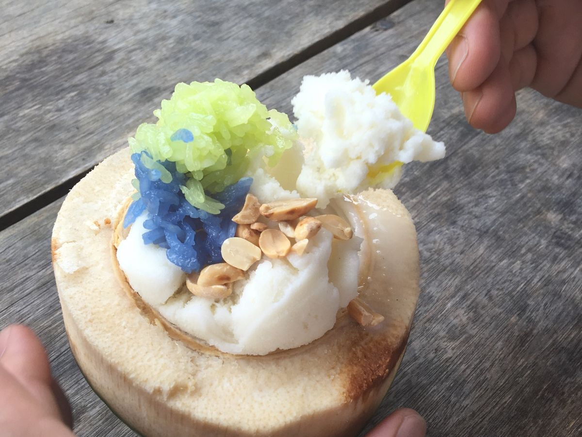 水上で人気のあったココナッツアイスクリームも買いました。こちらは60BHTでした。