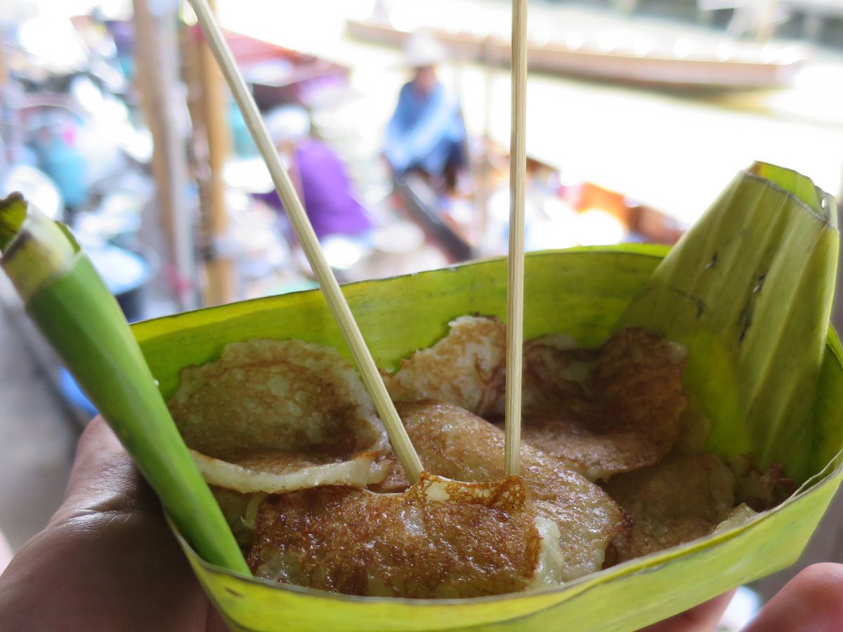 朝7時頃に集合し、バンに揺られること1時間弱、まずはココナッツファームに立ち寄ります。ここでは実際にココナッツの実や花を用いてココナッツオイルやミルクの作り方を説明していただきました。その後約30分で水上マーケット近くの駐車場に到着。マーケットにはスピードボートで向かいました。時々水しぶきがかかりましたので、汚れてもよい服装でお出かけされることをお勧めします。マーケットは新鮮なフルーツや郷土料理・雑貨などを売る現地の人と観光客でごった返しており、とても賑やかです。自由時間が1時間半程あり、地上の散策だけでは時間を持て余してしまうので、やはり200Bとそこそこのお値段はしますがw手漕ぎボートに乗って見学するべきだと思います。揚げバナナとココナッツパンケーキを食べたのですが、良心的なお値段の割にとても美味です。最後にガイドさんがマーケットが良く見える撮影スポットへ案内してくださり写真も撮っていただきました。とても良い思い出ができました。