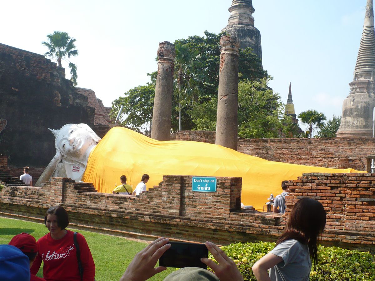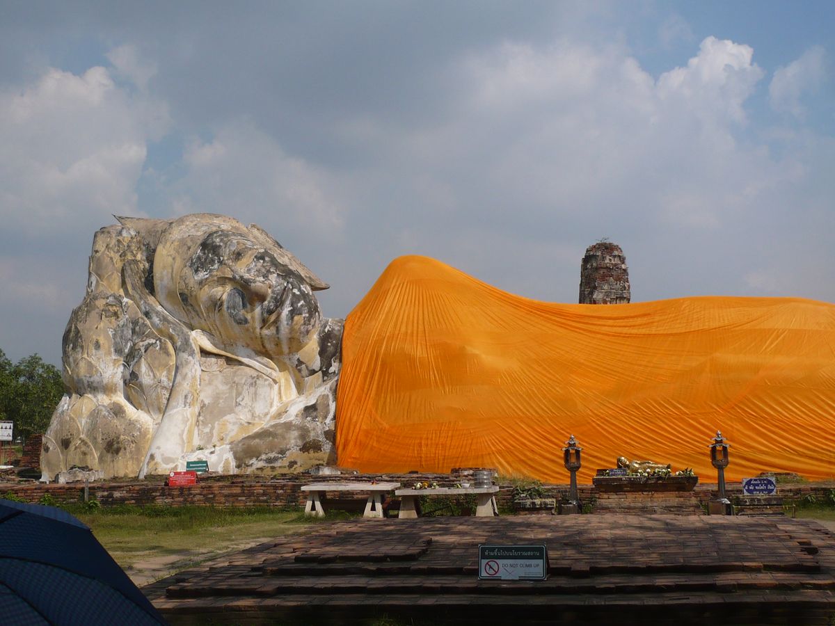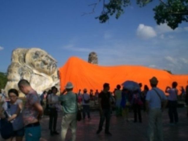 バンパイン宮殿は、以前の王様の夏の離宮だったようですが、多彩な建築物、手入れされた庭でとても美しい場所でした。立ち寄ったお菓子工場(工場といっても、完全手作業)、アユタヤの特名物「ロッティサイマイ」は、飴を糸のように細くのばした物を、もちもちした生地(クレープみたいな)に巻いて食べるのですが。よい匂いと、そこそこの量なのに、値段も安かったため、だめもとでもと買いましたが、これが、おいしかったです。日本にはない味、食感でした。像に乗れる場所にも案内してもらいました。翌日他の場所で像に乗ることにしていたため、そこでは乗りませんでしたが、そこで、売っていた服などはとても安かったです。アユタヤ観光では、現存する遺跡から、焼かれた後の建物、首を切られた仏像など激しかったであろうビルマ軍の攻撃を感じながらも、アユタヤ王朝が、いかに繁栄していたかが、想像できるものでした。アユタヤで最後に行ったワット・ロカヤスタ。まわりには寺院も本堂もなく、長い手足をゆったりと伸ばし、静か笑みを浮かべているかのように横たわっている寝仏像様の姿に、繁栄を続けたアユタヤ王朝から今に至るまで、時代の栄枯成衰を見つめ続けているような気がしました。途中の昼食については、タイ料理を中心としたビュッフェ形式でした。口にあうものもあれば、ちょっとと感じるものもありましたが、種類は適度に豊富で、清潔な感じでもあり、よかったです。
