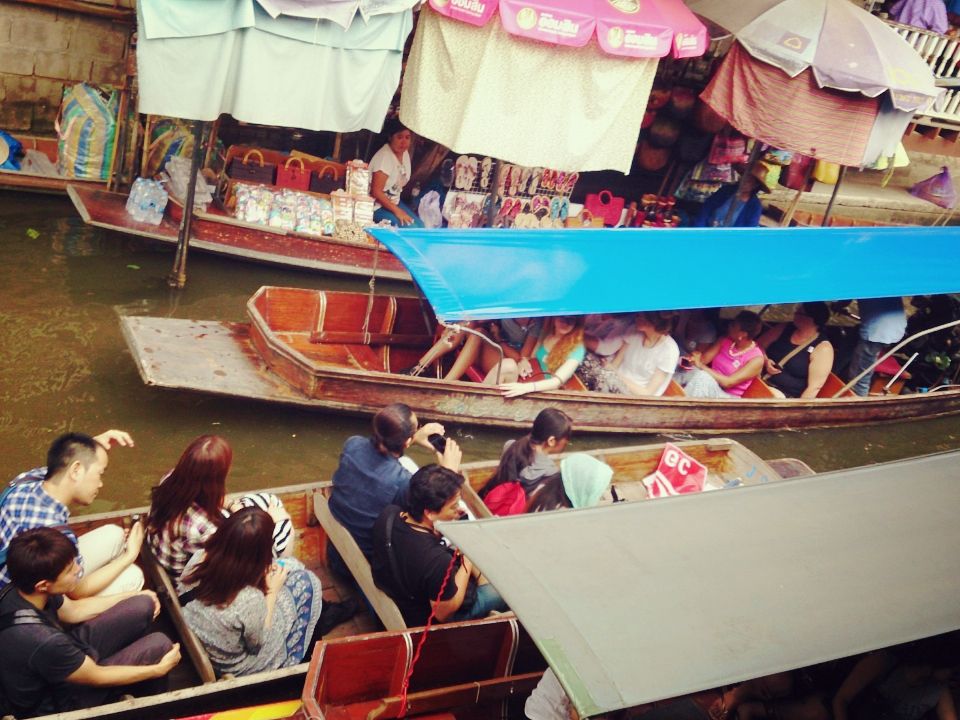 土産物屋のならぶ水上マーケットの乗り場までは連れて行ってくれるが、基本はそこでフリータイムの放し飼い。ここまで来て船に乗らない訳にはいかないので、言われるままにひとり数百バーツを払って、手漕ぎの船に乗る。同乗者も一様に、えっ❗️という感じで、軽い詐欺にあったような印象である。是非とも、紛らわしくないわかりやすい表記を求めたい。船の料金は、確かひとり3百バーツだったような気がする…