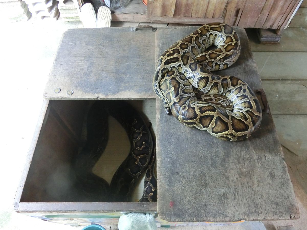 そこで一番後ろに座っていた私に突然、スネーク屋の旦那がヘビをさわれと、首に巻いたヘビをだしてきました。