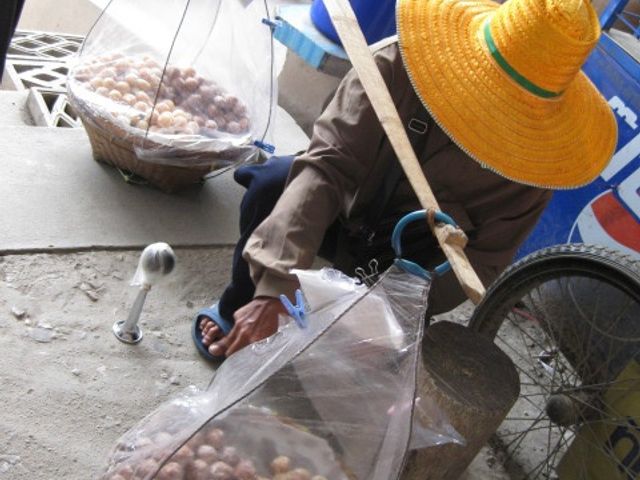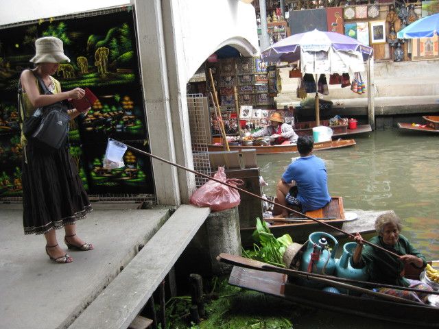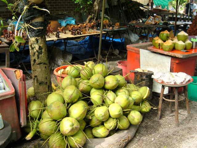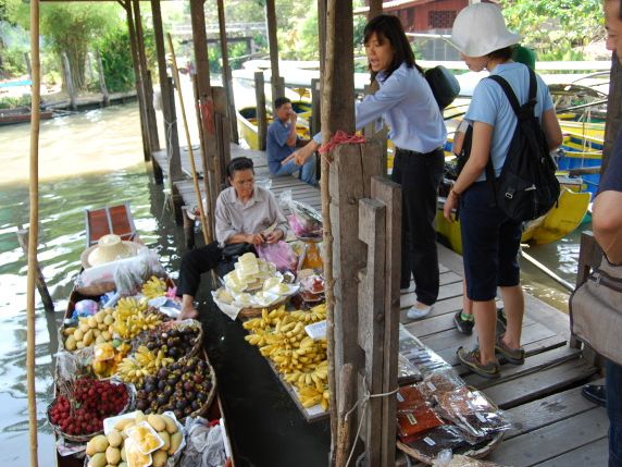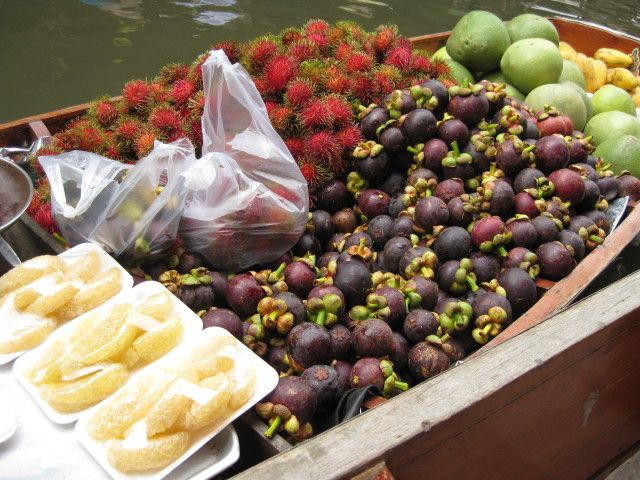 フルーツはおいしいです。バンコクの市内やそこそこのスパーを覗いてもフルーツの種類が時期的に少ないのですが、さすが観光の水上マーケット、手漕ぎボートの乗り口で売っているフルーツは、なぜかドリアンも食べごろが売られていましたし、マンゴーも端を切って熟れ具合を見てから、食べやすくカットしてくれる細やかさです。是非、食べてみてください。おいしいです。