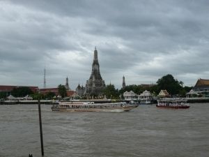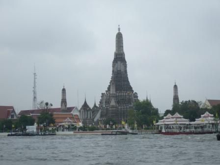フェリーでワット・アルンに向かうときはワクワクしました。前日が雨で、この日は曇りでした。朝日があたっていれば、まさしく暁の寺だったのでしょうが。