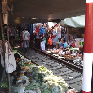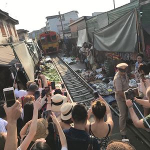 メークロンは他の観光客も多く、実際に列車が通過する際は大混雑になるため、踏切の遮断器内側(線路側)に陣取るのがオススメです。迫力のある光景を一番目に出来ると思います。
