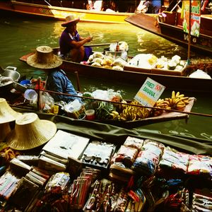次にダムヌーン・サドゥアクへの水上マーケットへ向かいます。ラーマ4世時代に造られた運河は、現代に伝える水上都市です。マーケットに向かうまでは、食料品を運搬する小舟が行き交っています。マーケットに到着するとオプション200バーツを払い、手漕ぎボートに乗船。