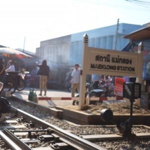 バンコクから西へ70kmに位置するメークロン線の終着駅(メークロン駅)へご案内します。このメークロン駅の名物は、何と言ってもこれしかありません…列車運行中の線路上で開かれている驚愕の市場!