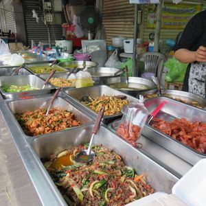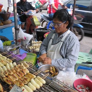 線路市場と平行に走っている道路にもソンテウやバイタク相手の安いお店や露天が出ておりスイーツから焼き鳥、ツクネ風フランクの串焼き(スパシーな肉にくしさで、アロ~~イ)