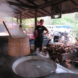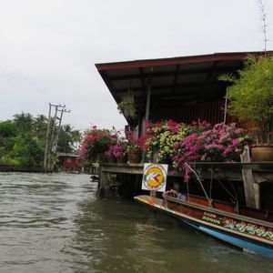 日曜日だったからか、早めに線路市場についたようです。一列になってなんとか通れるスペースしかなく、線路いっぱいに商品が並んでいました。列車到着まで結構自由時間がありましたので、線路をもう1往復できたくらいでした。列車の通過時間から、実際に目の前を通過するまでかなり徐行運転で何度も止まったので、時間がかかりました。列車に乗っている人の方が羨ましかったです。ココナッツファームではココナッツオイルとか砂糖を作る工程をざっと見られます。お土産ものがメインでした。水上マーケットはスピードボートに乗って移動したのですが、この移動中に見た川沿いの家並みが生活感があって良かったです。実際の市場はちょっと観光地化されていて同じようなお土産物ばかりが並んでいましたが、他ではあまり見られない光景なので来て良かったです。軽食はあっさりしたラーメンで、おかわりがほしいくらいでした。麺も辛さも選べます。全体的に午前中で終わるツアーなので、午後から時間が使えるので良かったです。