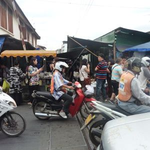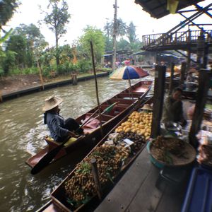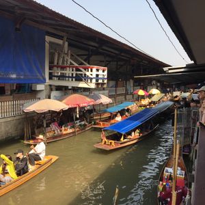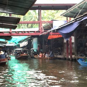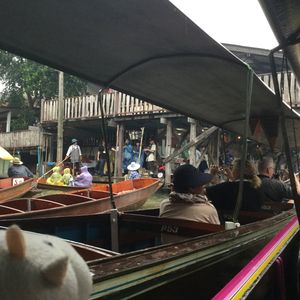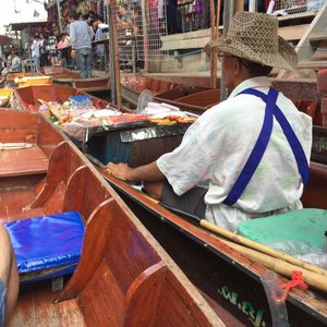 日曜日だからか、メークロンまではとてもスムーズに着きました。線路内はとても賑わっていて、地元の人より観光客の方が多いくらいでした。線路ギリギリまで商品が並び、人がすれ違うのがやっとでした。いざ、列車が来る頃になると、人が多すぎてクラクションが鳴り響き、撮影も難しいくらいの混雑でした。お店の人もちょっと観光客に迷惑しているようでした。今度は列車に乗って線路市場を通過してみたいです。ココナッツファームで休憩した後に水上マーケットでしたが、スピードボートと手漕ぎボートのギャップが楽しかったです。観光客向けとのことで、観光客だらけで川の上はボートで渋滞していました。手漕ぎボートは別料金ですが、乗ってよかったと思います。店はどこも同じようなお土産ばかりが並んでいました。値段交渉が楽しかったです。タイ式ラーメンは美味しかったです。軽食程度だったので、ちょっと物取りなかったです。全体的には混雑しすぎだなーと感じたので、平日のほうが良かったかな、と思いました。